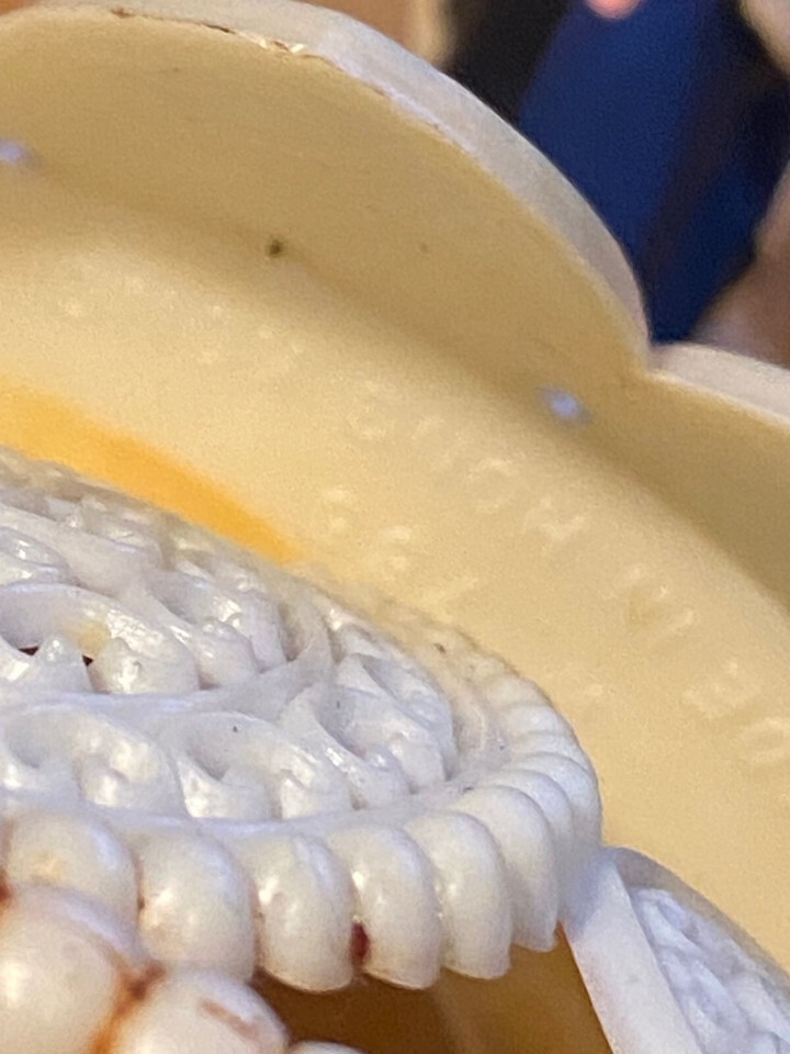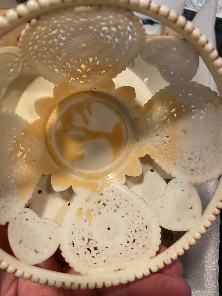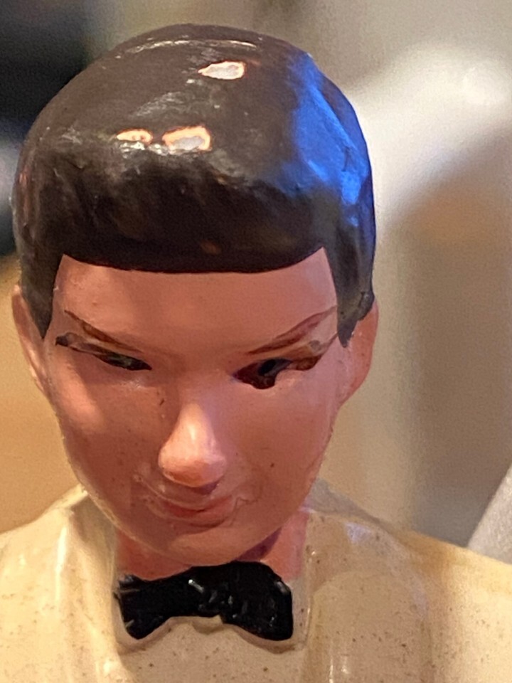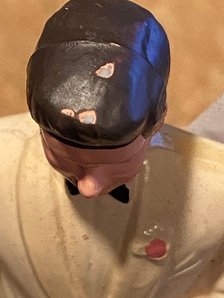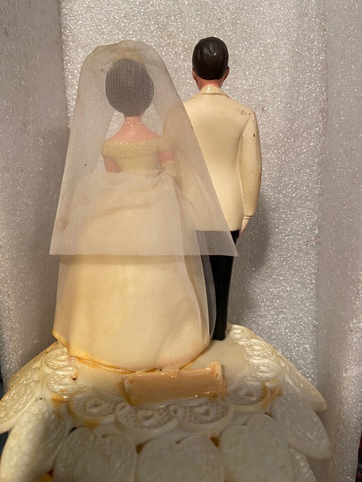 there is wear on the couple. The groom has some paint in his hair that is worn away and the bride's dress has some staining on the bottom.