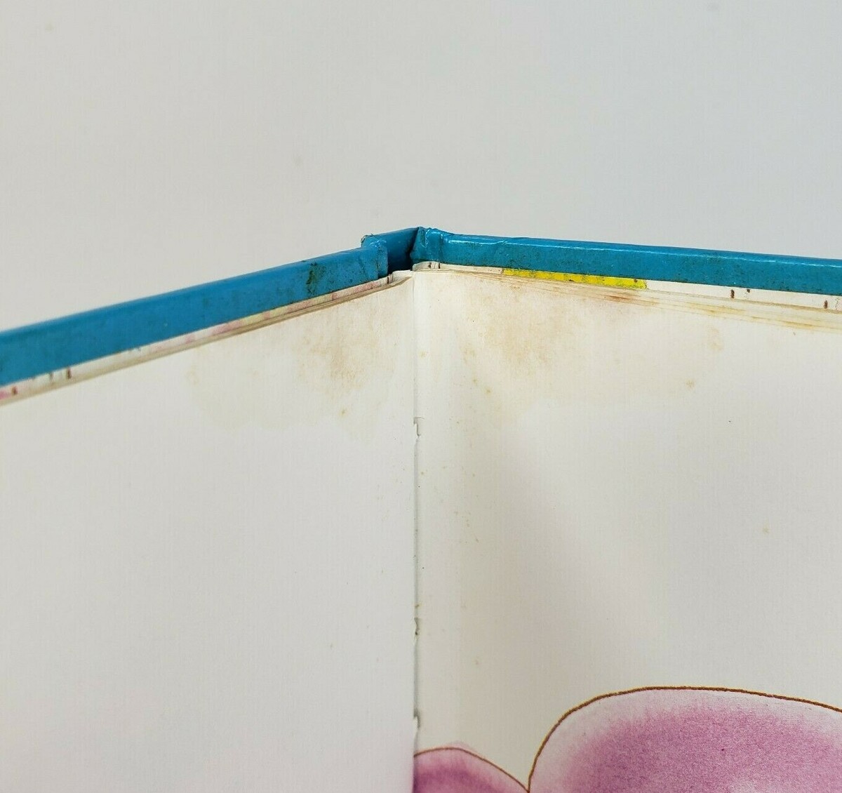 There is staining on the tops of all pages near the spine