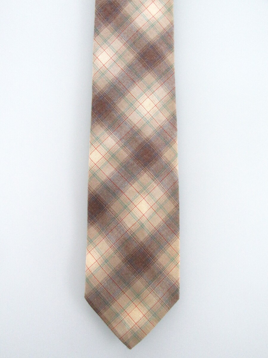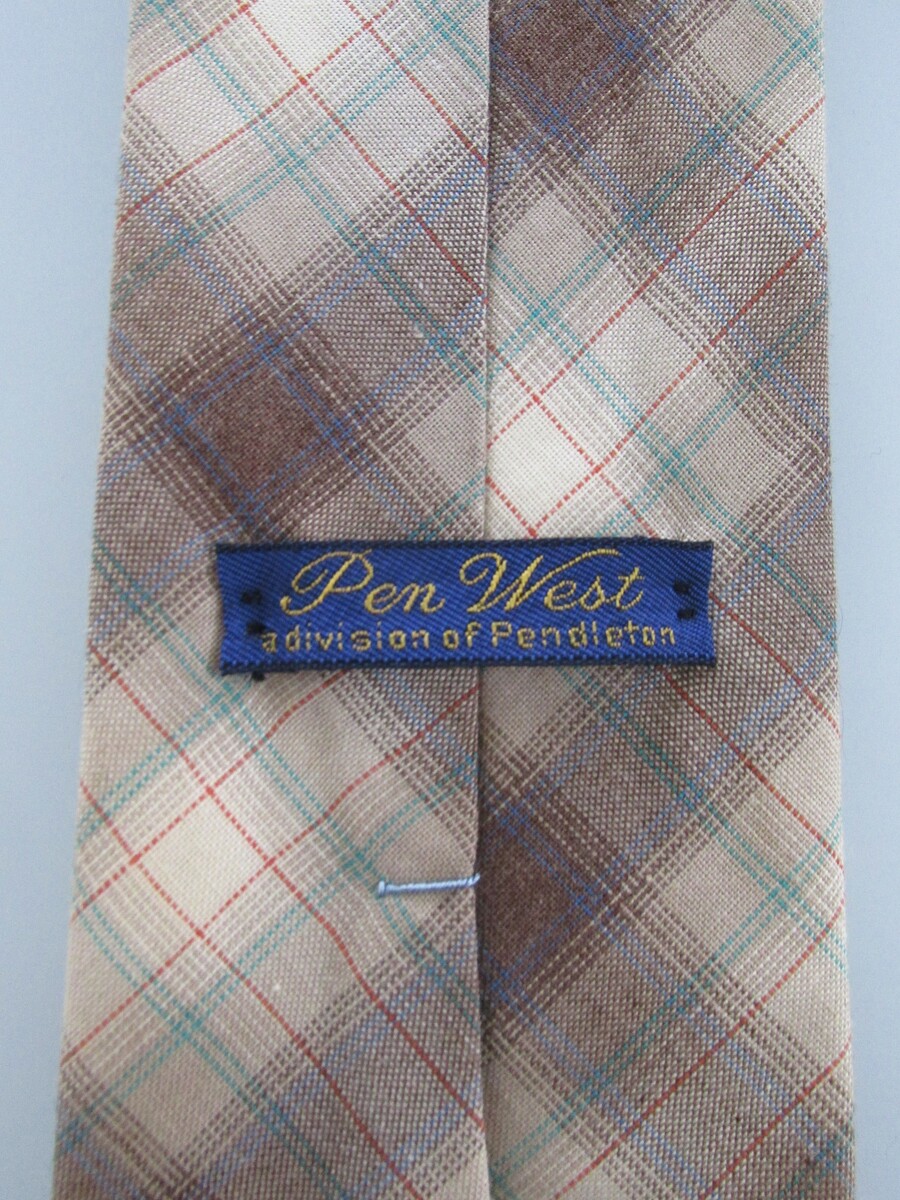 Description: Up for sale is a Pen West Pendleton vintage men's tartan plaid tie. It is made in the USA of 50% cotton/50%poly. Dimensions are approximately 55" long x 3 1/8" wide. It has a multicolored tartan plaid pattern in brown, tan, ivory, green, red. This tie is in excellent condition.
