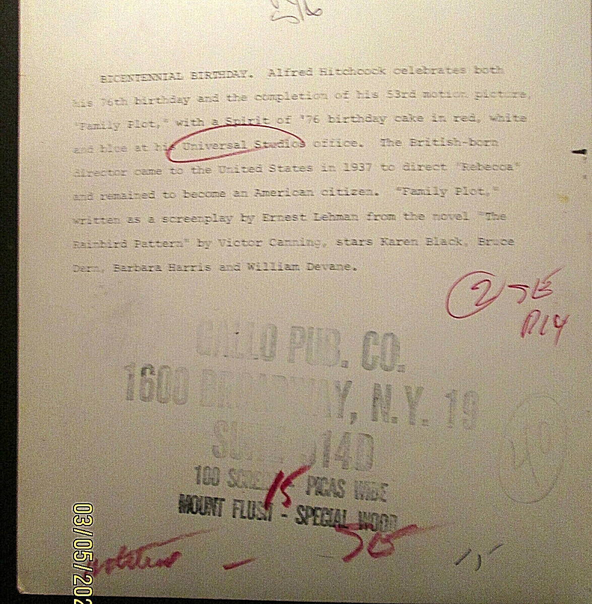 ALFRED HITCHCOCK :DIRECTOR : (ORIGINAL VINTAGE CANDID ON THE SET PHOTO ) # 8 (SIZE 8X10) ORIGINAL VINTAGE (NOT A COPY OR RE-PRO) HITCHCOCKS BIRTHDAY ON THE SET OF FAMILY PLOT