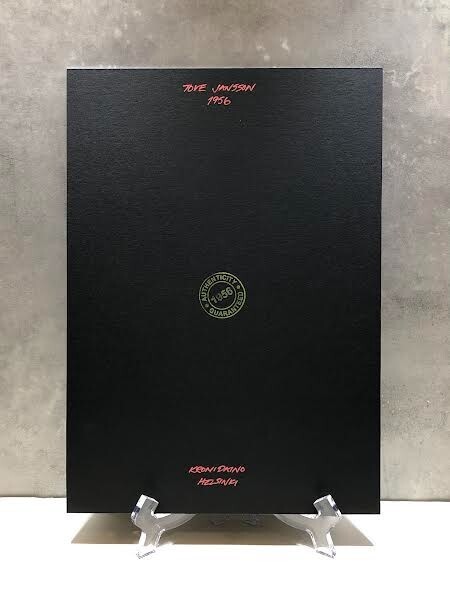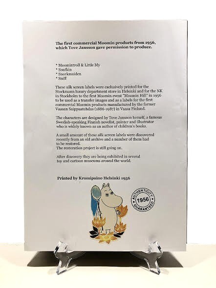After rediscovery from an old archive, the authenticity of these high quality silk screen prints were verified together with the Moomin Museum before exhibition and confirmed that these are the first commercial Moomin prints ever.