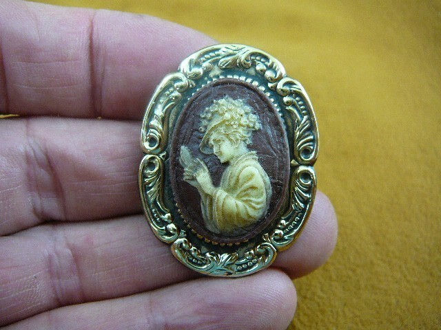 (Internal #CS41-12) Excellent, new, hand stained natural pine resin, hand-molded (-duced from the original shell cameo) WOMAN in HAT looking in HAND MIRROR cameo pin/pendant in OFF-WHITE color with BROWN background color is mounted on - - brass, cameo itself is 7/8" across x 1-1/8" long. Clasp pin/pendant glued on back vertically.