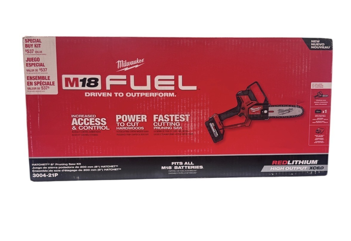 Category: Cordless hand toolsType: SawBrand: MilwaukeeModel number: 3004-21PModel name: Hatchet 8" Pruning Saw KitSize: 8"Color: Red BlackPower source: BatteryBattery Included: yesCase included: noCharger Included: yesVoltage: 18Condition:New (Open Box)