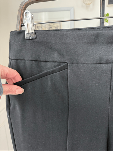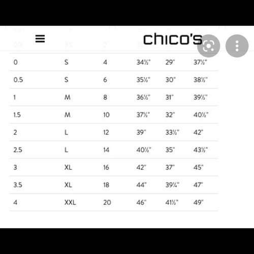Chicos So Slimming pull on dress pants with flat front and flat lay seam pockets at the hips. Wide band stretchy waist. Polyester, rayon and spandex blend. Laying flat measures 15.5 inches straight across the waist with an 11 inch rise and a 29.5 inch inseam. The front and center seemed down each leg is slimming. Tag size one which in Chico?s proprietary sizing is roughly equivalent to a US size medium or eight. Dress up or down. This style of pant was my go to when I worked. No fading, stains, holes or signs of wear