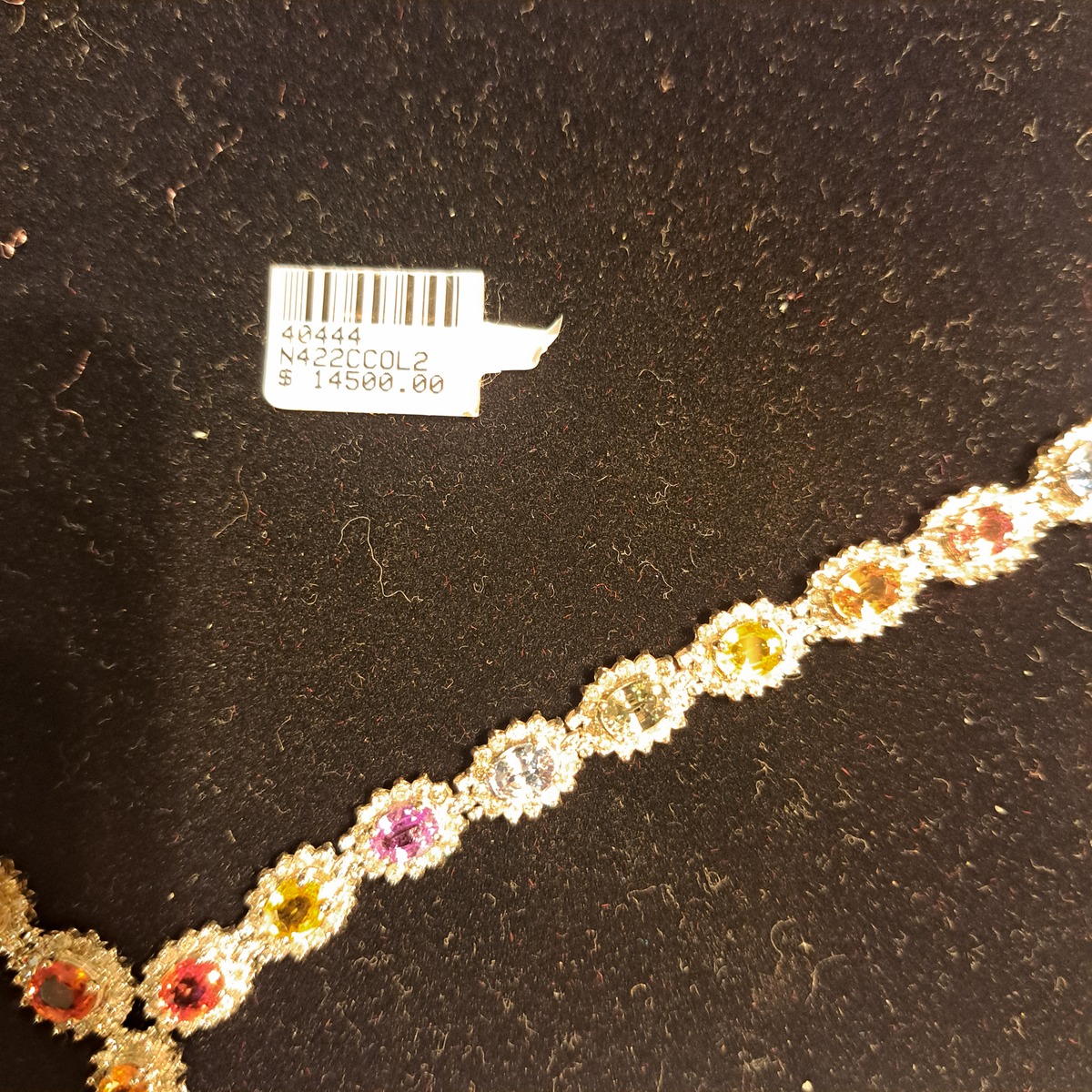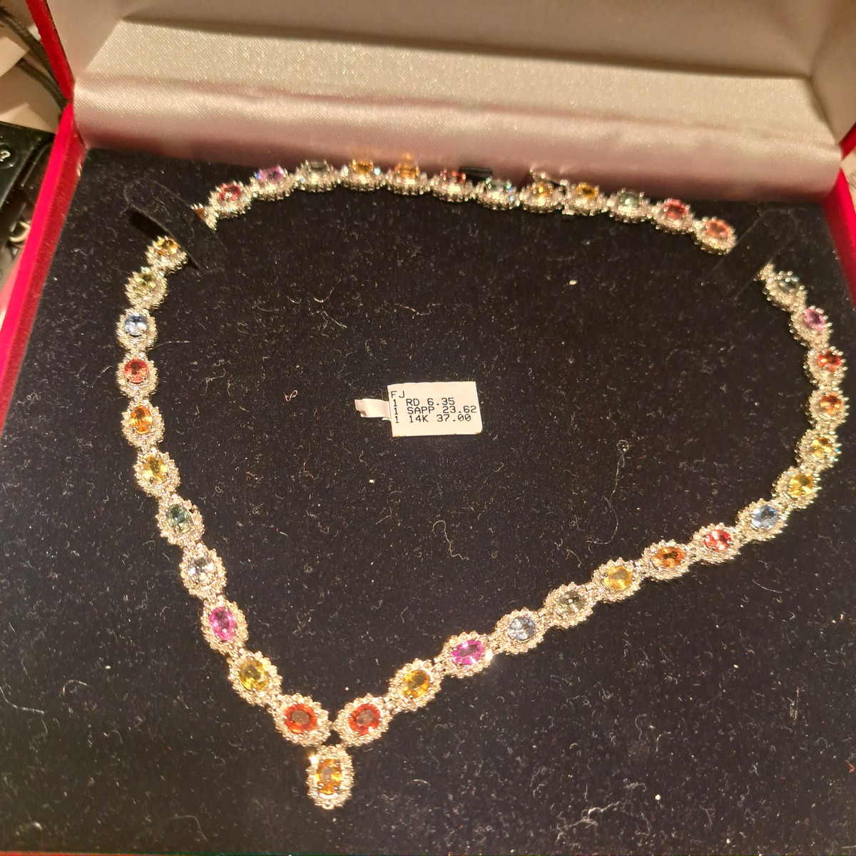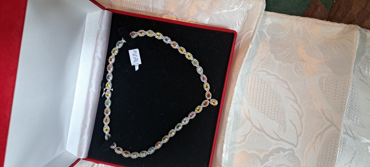 This is 3 Of 4 Heirloom Quality Vintage / New Necklaces. I have committed to sell the first of the 4 at the original price plus tax insurance. It doesn't matter which one but the more the original price the greater the buyers equity. Foe example the fourth necklace comes with almost twice the equity. Though this #3 is not the highest price of the 4 it's my favorite. Its elegant but not presumptive. it's delecate but make a vibrant statement. I couldn't find a comparal necklace because first it's so hard to find natural gemstones, most gems are lab grown these days. I mean first you have to find them, then mine them, clean, cut and polish them to bring out their beauty, or I guess you can just mix it up in a lab. The profits of that are enormous, but hey, you get what you pay for. I did find a simple diamond tennis style 6.35ctw 16" but those would have to be some tiny diamonds. I did find a 6.23ctw Natural Diamond Tennis Necklace at ANGARA, I doubt the wiould object to the free advertising. It looks very pretty but what makes my piece is the Colorful Sapphires. Also spreading that carat weight end to end over 16' the stones must be small and it seemed all the positive feedback was on the larger necklace. The necklace was listed at $12,329. but is marked down to $10,849 That comes to $1,741.41 per carat. Now that's a comparison I can live with this beautiful necklace comes to $483.82 per carat. Less than 50% the cost, and beauty, no contest! Small wonder the professional jewelers I presented the necklaces to suggest they're worth 3-4 times the price on the antique tags. The price I posted includes the taxes and insurancee. If Bonanza adds sales tax please dont pay it I will adjust the bill so you do not get doubled tapped. S H is on me