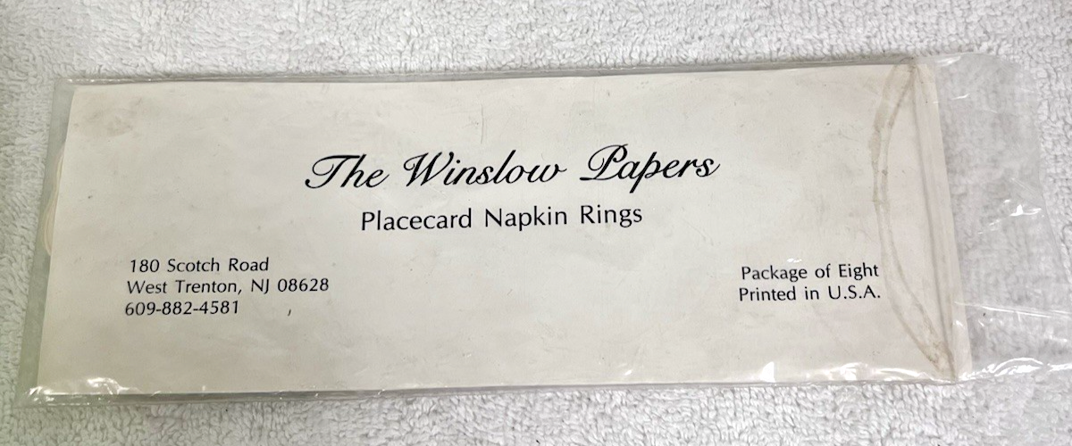 The Winslow Papers Roses Floral Paper Placecard Napkin Rings Judith Winslow Set of 8 Original Packaging. Unused set of 8 napkin ring holders ae in very good condition the plastic sleeve cover shows age, paper information piece inside as well. Napkin rings measure approx. 6 7/8" long unused.