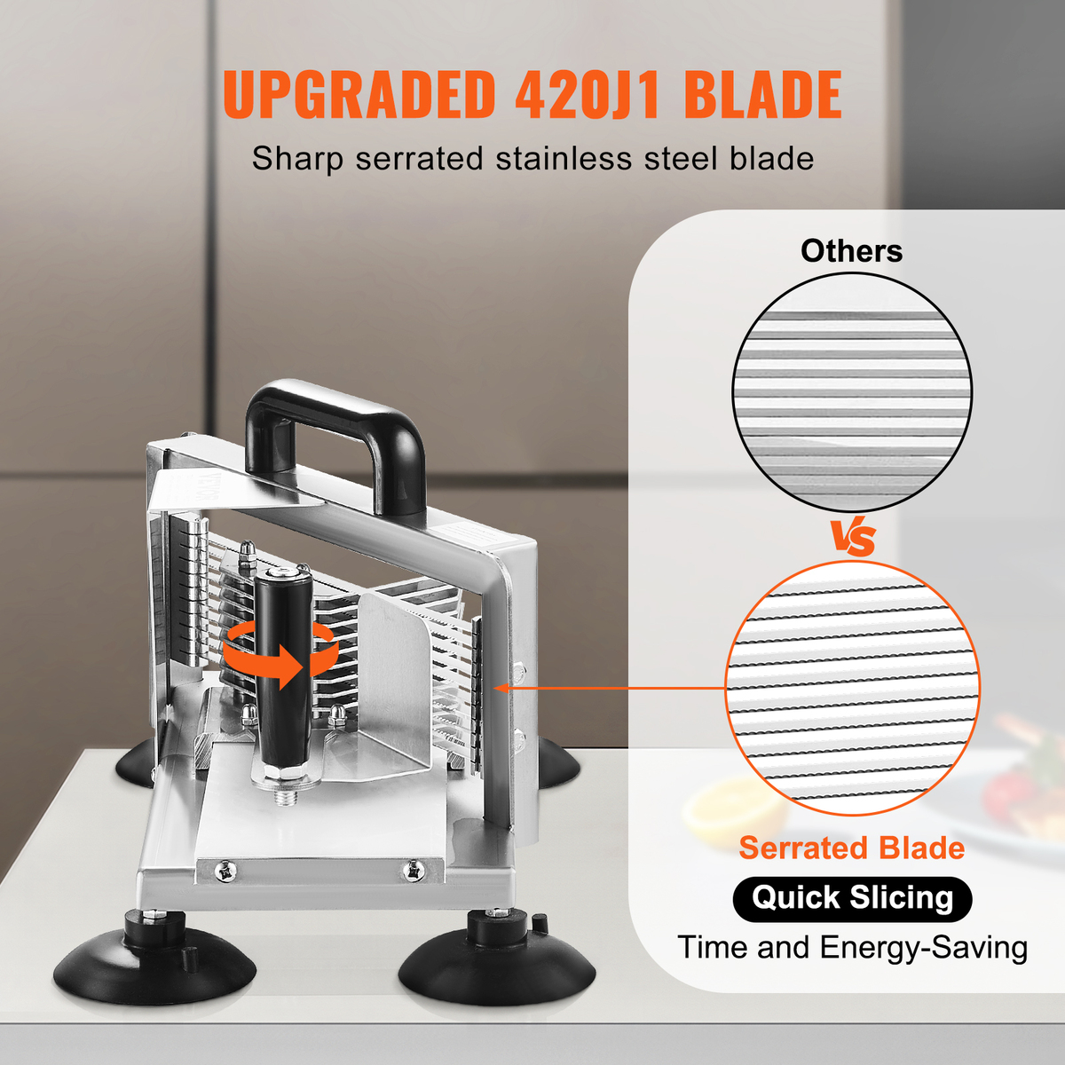 High Stability: Featuring a heavy-duty stainless steel body and 4 suction cup feet, this commercial tomato slicer can adapt to various tabletop surfaces, protecting your countertops and ensuring the device stays in place for smoother slicing operations.