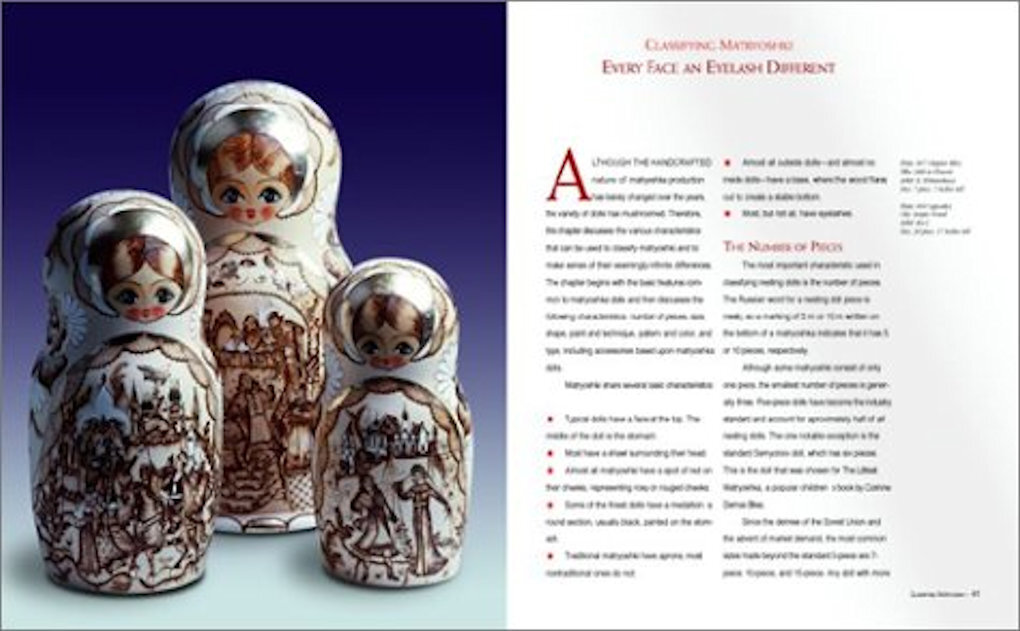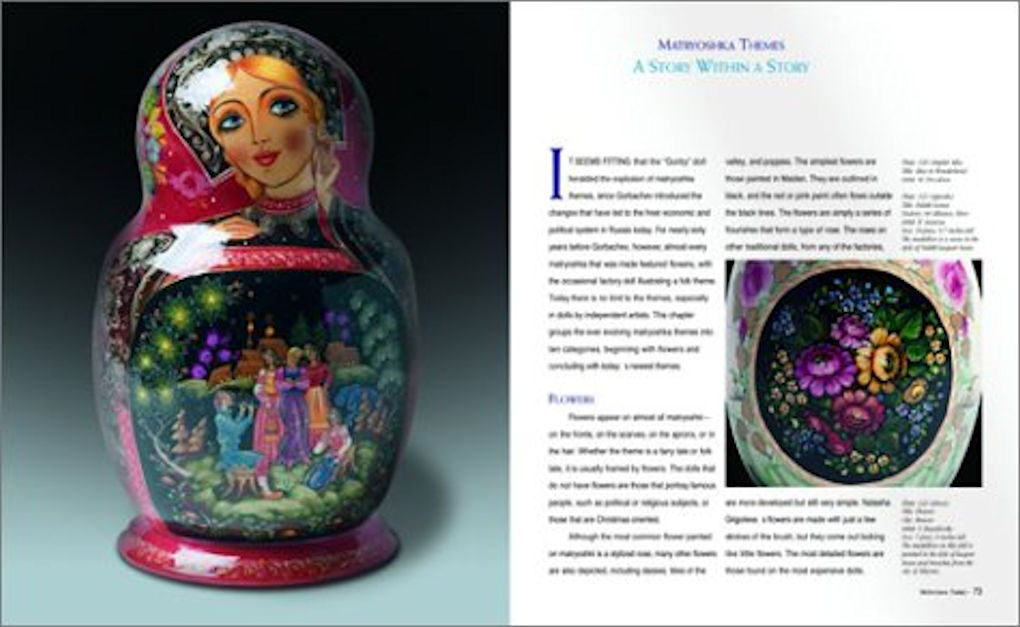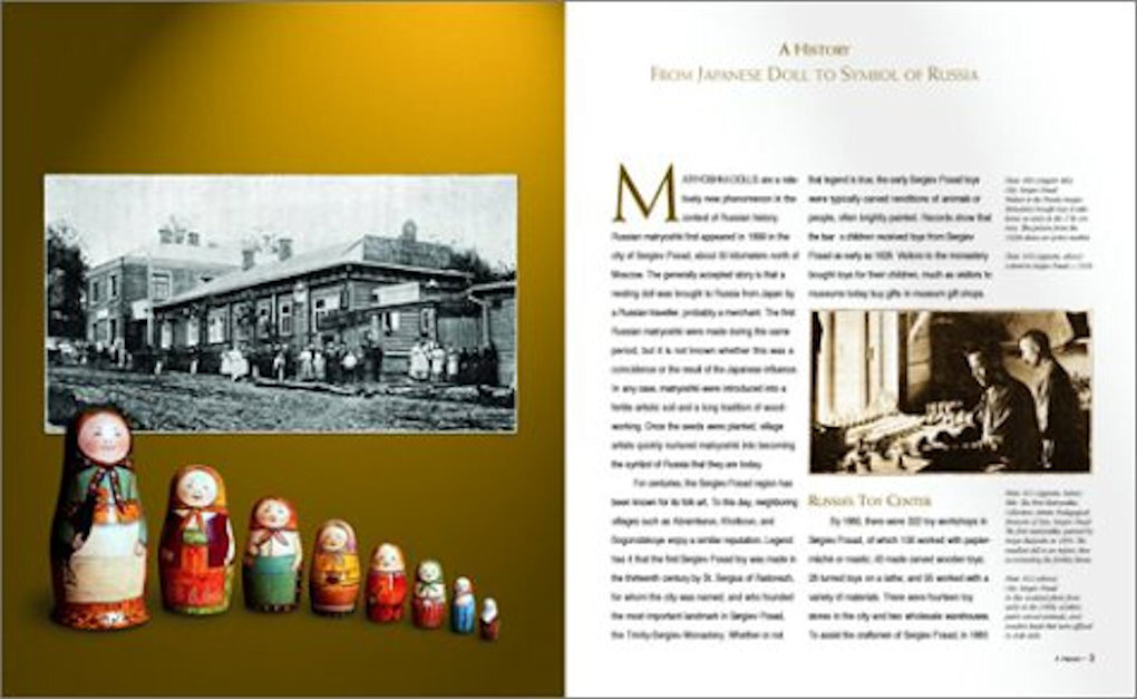 The book is the complete account of the history, production, varieties, and creators of the nesting doll that has become a symbol of Russian folk culture, if not Russia itself. Contributing to the history are commissioned studies from three of Russia's leading authorities on toys and folk art. The book includes 330 color plates, 200 of which are carefully selected examples of dolls. The examples include: historical dolls from museums in Russia; factory products made throughout the Soviet period in the villages of Sergiev Posad, Polkhovsky Maidan, Semyonov, Kirov, and Nolinsk; and artwork of independent artists, photographed in several of the artists' home-studios, in private collections, and in the inventory of importer-author Rett Ertl.