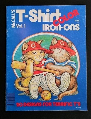 Vintage 1977 McCall?s T-Shirt Iron-Ons COLOR Vol. 1, featuring 20 retro designs intended for fabric transfer use. This book includes a fun mix of classic 1970s graphics, lettering, and novelty illustrations that were designed to be ironed onto T-shirts and other fabric items.