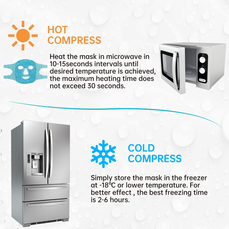 ?CONVENIENT TO USE?simply store the mask in the freezer at -18? or lower temperature for at least 2 hours. Heat the mask in microwave in 10-15seconds intervals until desired temperature is achieved,the maximum heating time does not exceed 30 seconds.