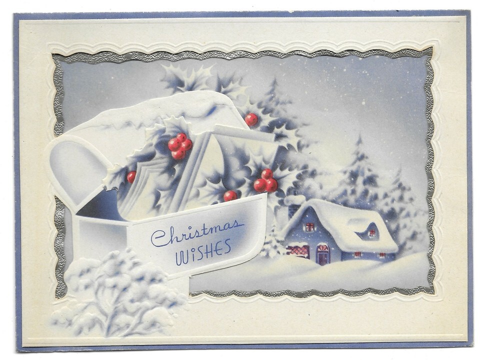 VINTAGE 1940s WWII ERA Christmas Greeting Card Foil Edge Die Cut SNOW MAILBOX