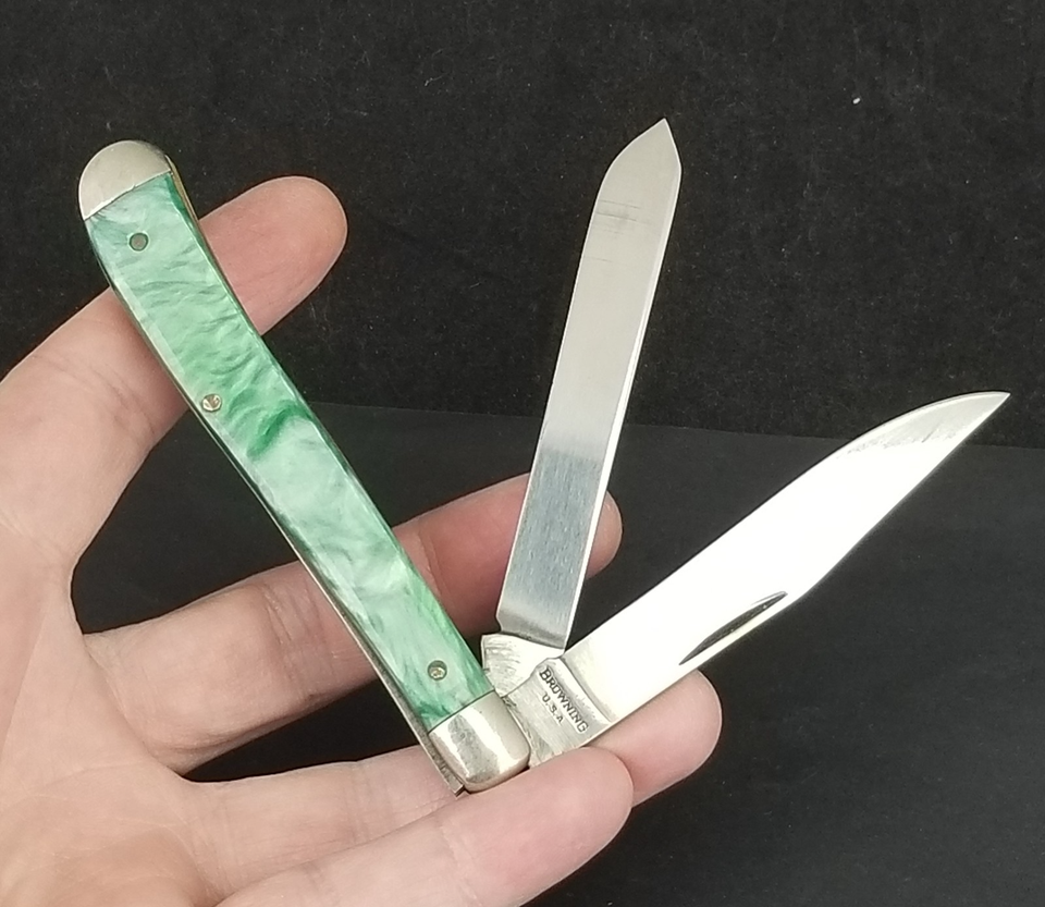 Made by Browning here in the USA. Beautiful green mother of pearl type scales. Double blade trapper.