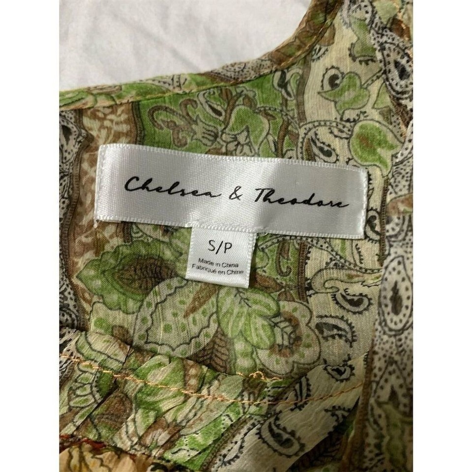The Chelsea Theodore blouse is a women's petite small featuring a multicolor floral pattern. It is styled with ruffle sleeves and a peplum design, crafted from viscose material. This blouse is machine washable and suitable for occasions such as casual outings or semi-formal events. The item is pre-owned.