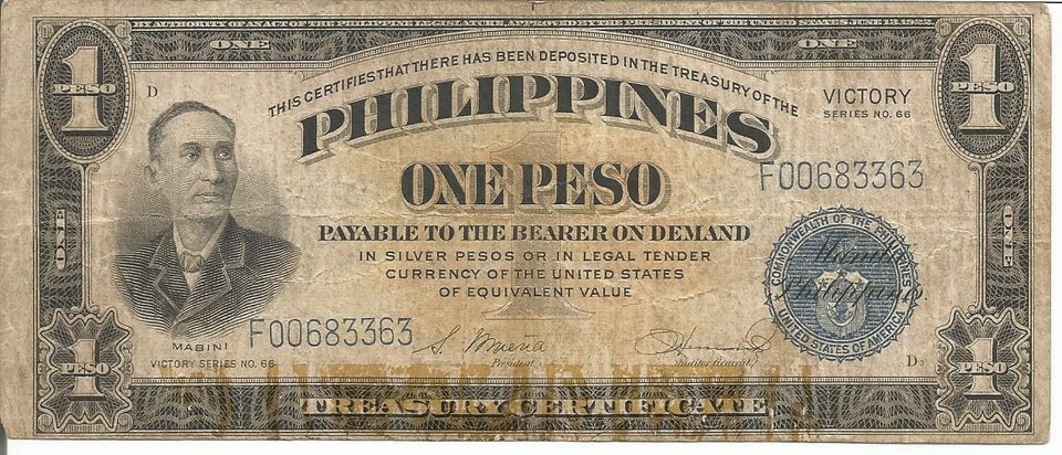 Philippines 1 Peso Victory Series of 1944 Cir. Banknote # 116