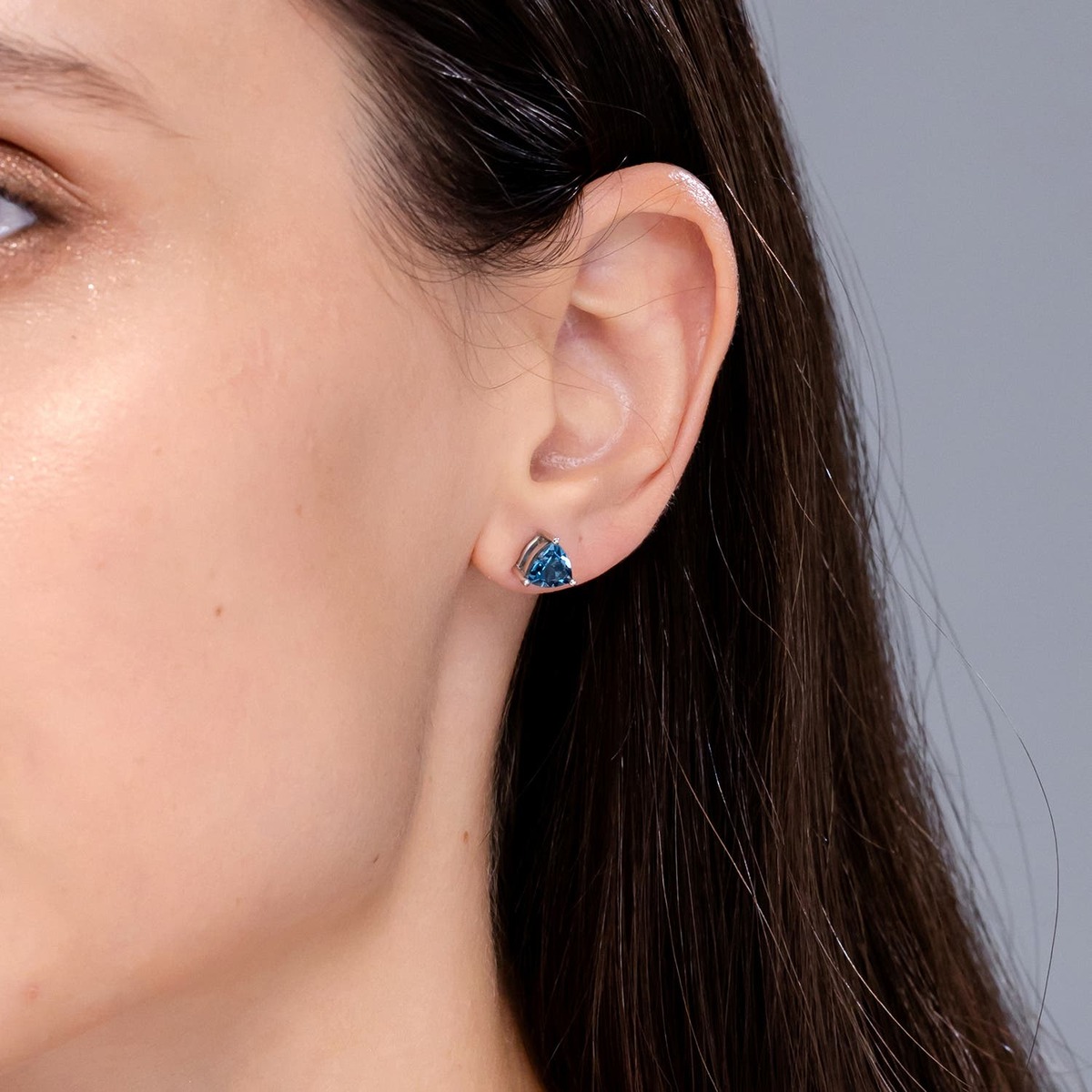 Exuding a subtle and charming hue, the trillion London blue topazes are secured in prong settings. These London blue topaz solitaire stud earrings are a pair of enviable beauty in silver.