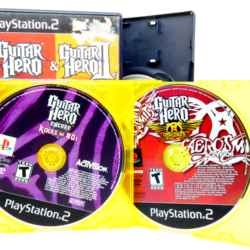 Guitar Hero PS2 Lot of 5 Guitar Hero Aerosmith (disc only great cond) 1 (ex cond) 2 (great cond) 3 (disc only good cond) Encore Rock of the 80s (disc only has scratches tested)