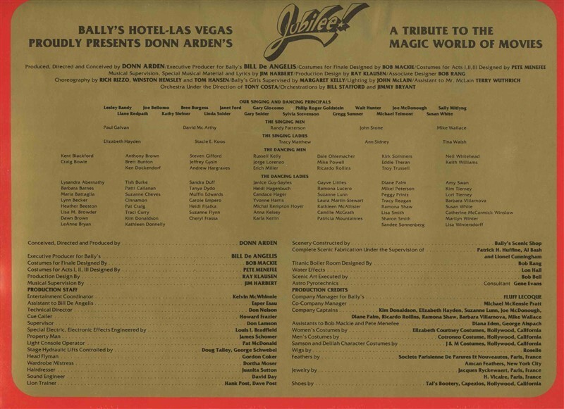 A Donn Arden's JUBILEE Program from Bally's Hotel and Casino in Las Vegas, Nevada from 1986. In very good condition. Includes the Dancing and Singing Ladies and Men and Bobby . And of course the famous sinking of the Titanic.