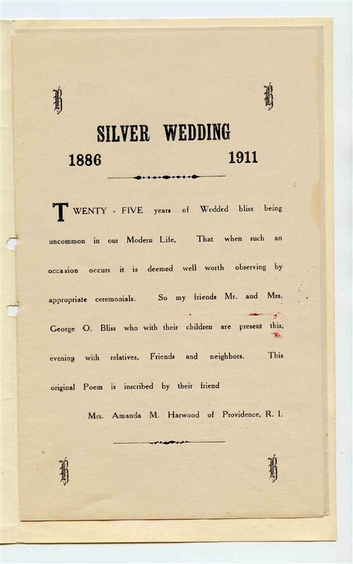 An 8 page paper booklet containing a poem . Silver Wedding 1886 1911 Poem by Amanda M Harwood of Providence Rhode Island. Presented at a party honoring the 25th Wedding Anniversary of Mr. and Mrs. George O Bliss. Measures about 4 1/4" x 7".