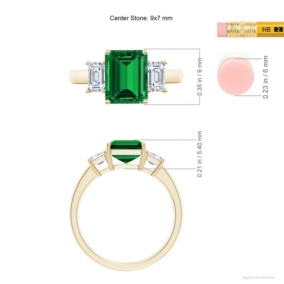The lab-grown emerald-cut emerald and the dazzling lab-grown side diamonds on this three stone ring will beautifully represent the past, present and future of your relationship. They are prong set on a lustrous 14k yellow gold shank and strike an eye-catching contrast.