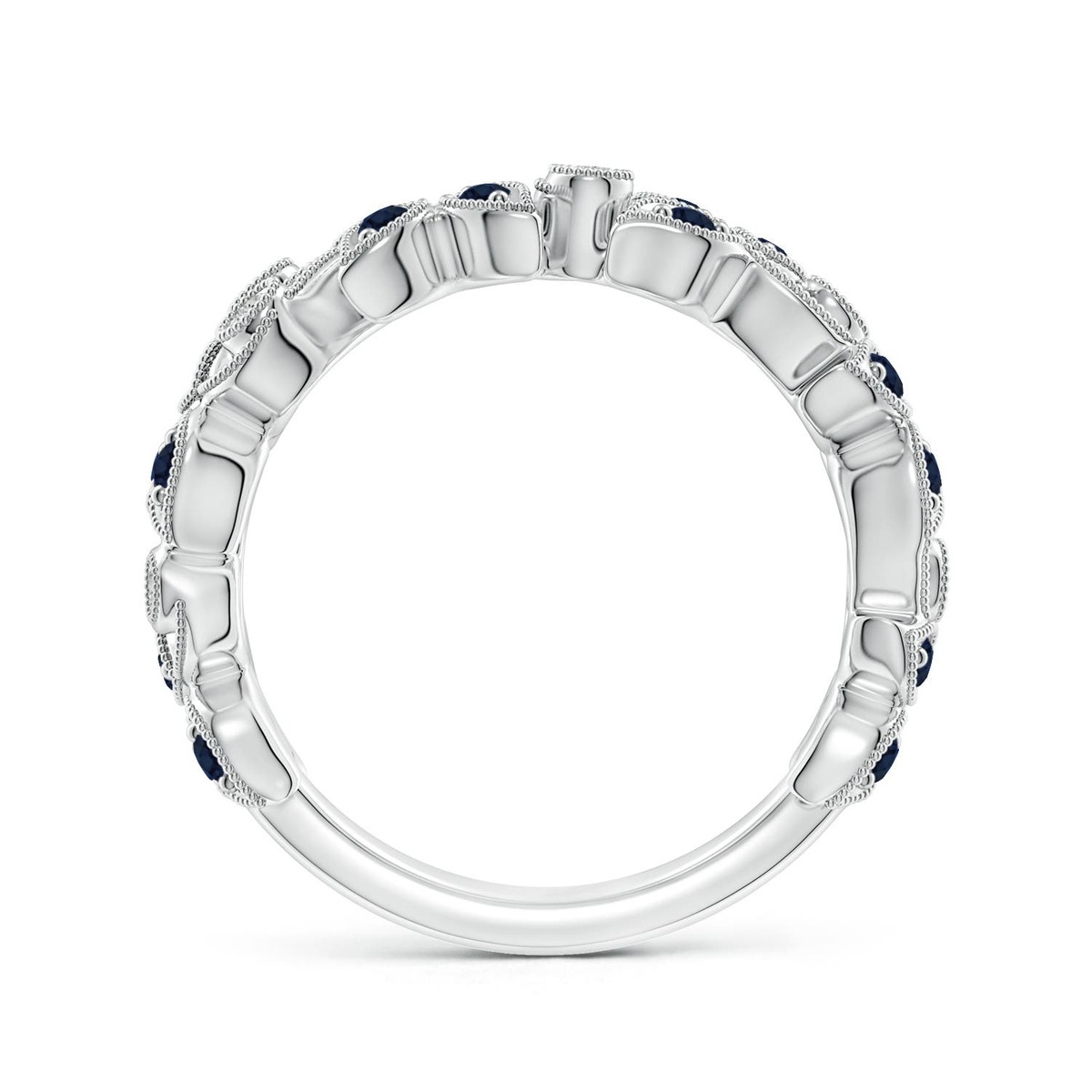 This wedding band showcases a nature inspired design and is adorned with pave-set blue sapphires and bezel-set diamonds. Milgrain detailing on the edges lends a touch of intricacy to this vine wedding ring crafted in 14k Gold.