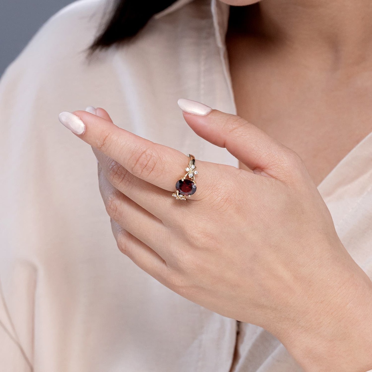 The oval garnet showcases an elongated form that maximizes light reflection. Its sophisticated shape is perfect for those who appreciate both classic beauty and contemporary style.