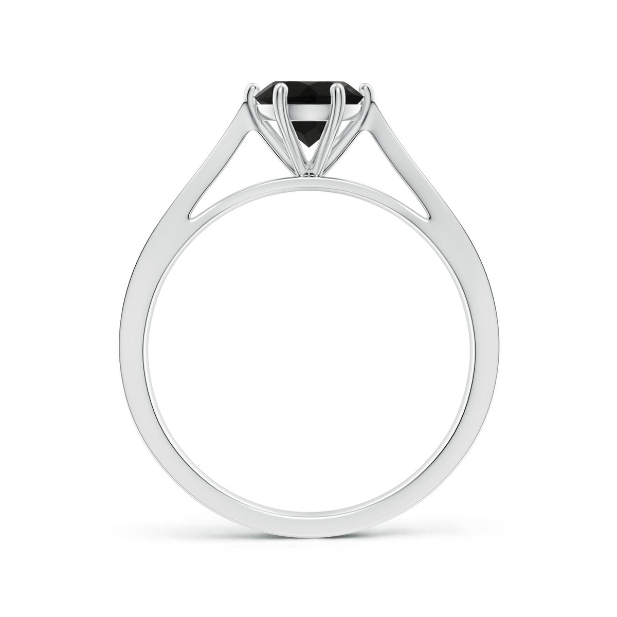 A round black onyx shines magnificently amid the silver reverse tapered shank ring. It is secured in an eight-prong setting for an exquisite look. Sparkling diamond accents on the shank accentuate the intense beauty of the black onyx.