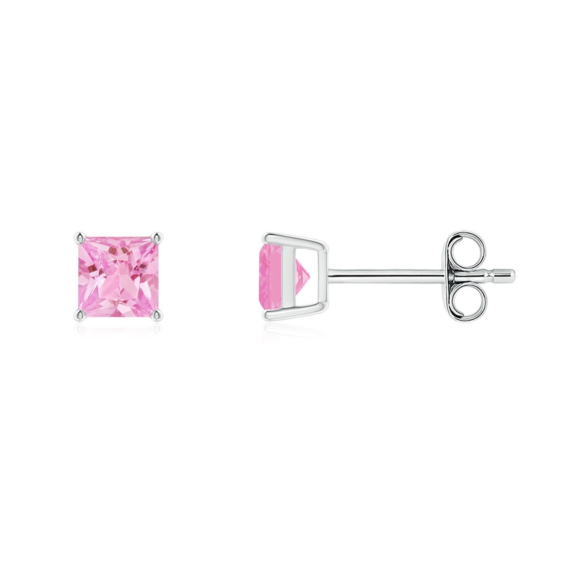 These classic pink sapphire stud earrings look striking and elegant. The square sapphires are mounted in silver basket prong settings and exude a blossomy pink allure.