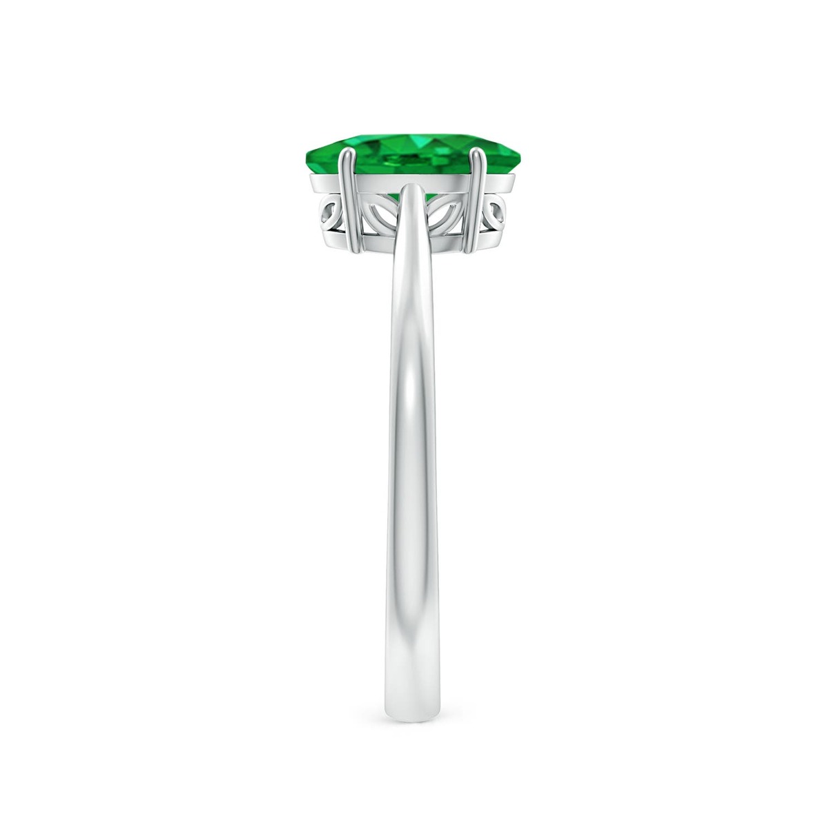 The solitaire oval emerald, mounted in a prong setting, exhibits a beautiful rich green hue. On the gallery of this silver cocktail ring is a dainty leaf-like cutwork for added charm.