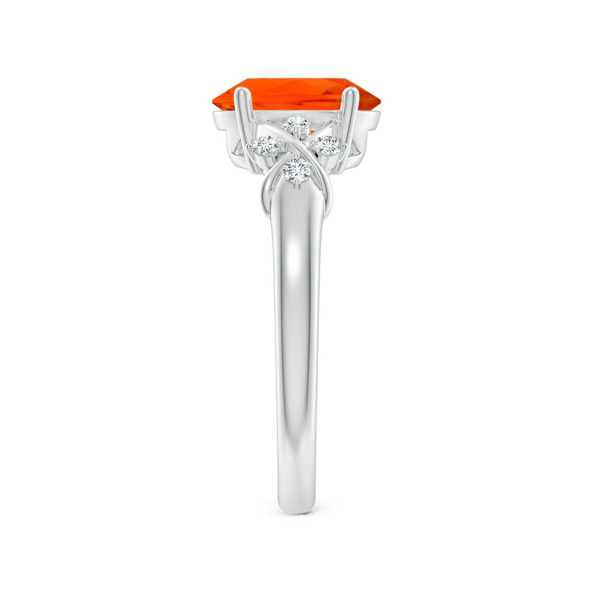 The prong-set oval fire opal looks radiant on this silver ring. It is flanked by criss cross motifs, coupled with dazzling diamond accents.