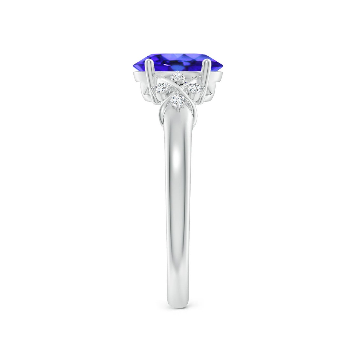 This silver ring showcases a bluish violet oval tanzanite in prong setting. Criss cross motifs and brilliant diamond accents adorn the shoulders of this tanzanite ring.