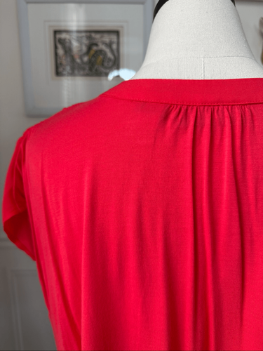 INC International Concepts coral red split neck, cap sleeve blouse with polyester, chiffon front and spring rayon jersey back. Tag size large. Laying flat measures 27 inches shoulder to hem and 23 inches armpit to armpit.
