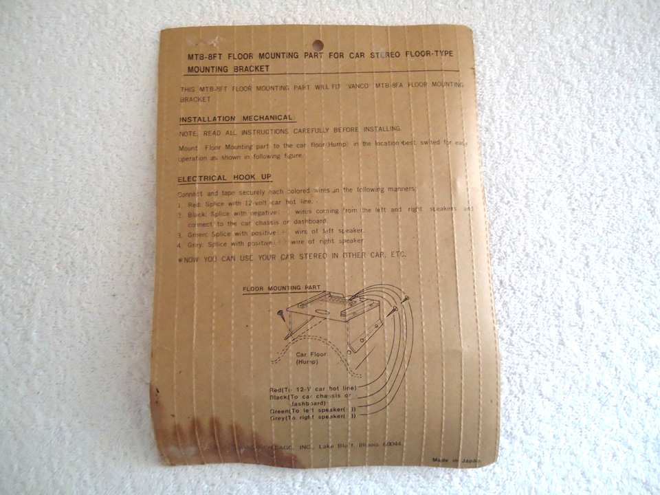 Here is a " NOS " Vintage Vanco MTB-8FT Floor Mounting Part For Car Stereo Floor Type Mounting Bracket " GREAT ITEM ".This is a must for anyone for a restoration or a collector,or decorator wanting that vintage retro look.If you have any concerns or questions about this item(s) please ask before bidding / purchasing because this item(s) is being SOLD AS IS.Thank You.-(PC174)