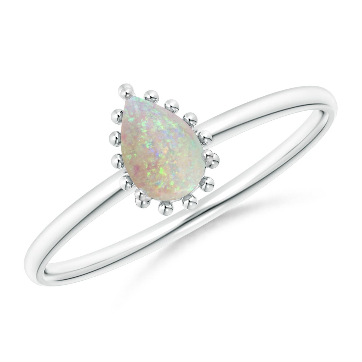 Crafted in silver, this solitaire opal ring has a visually appealing design. Its sleek metal shank holds the iridescent cabochon opal in a prong setting. The pear-shaped gem is surrounded by a striking beaded halo.