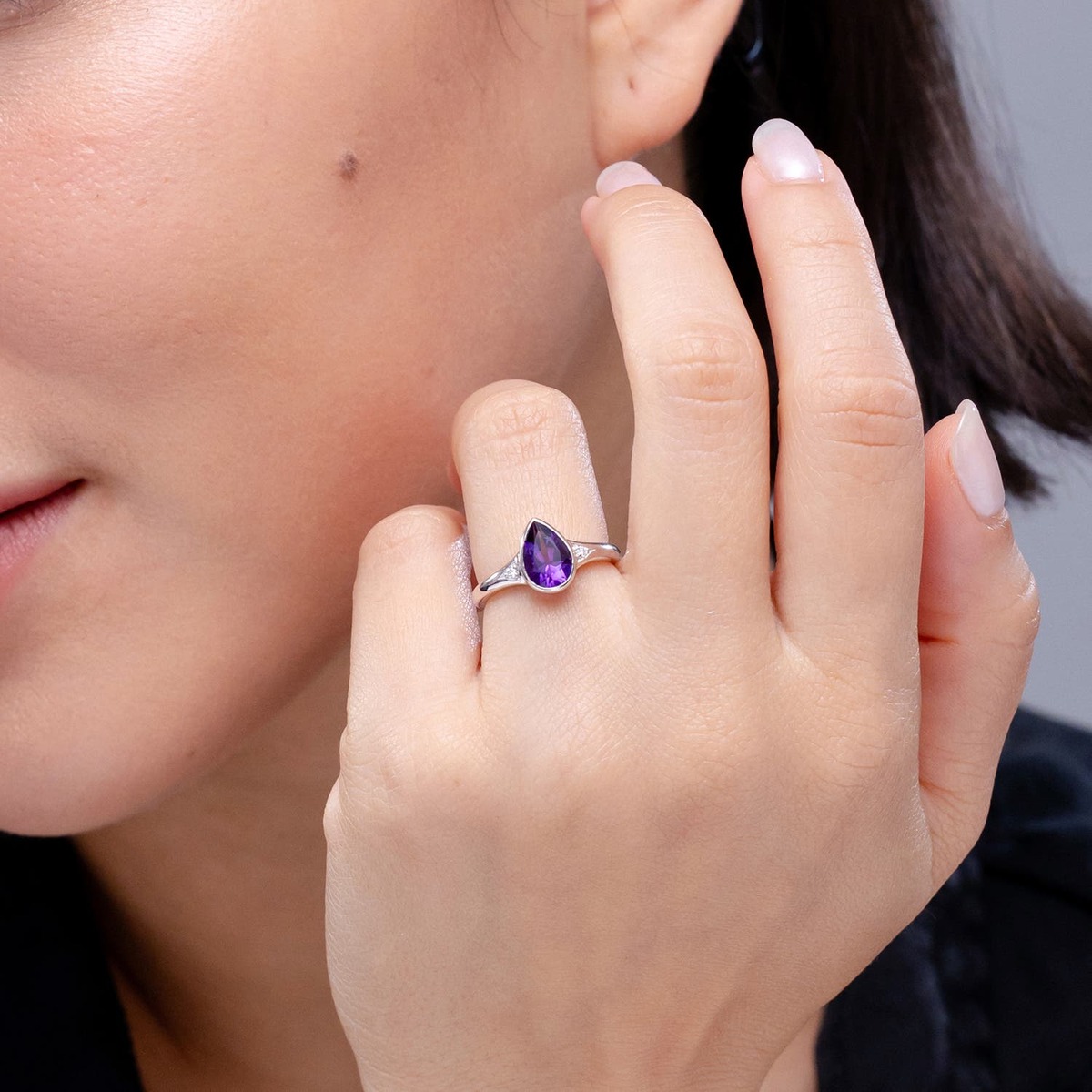 Bezel-set on a polished wide shank is the pear-shaped amethyst that exudes an enticing royal purple hue. It is flanked by diamond accents that are nestled within the cutout grooves of the shank. This silver pear amethyst ring will take your breath away with its sophisticated allure.