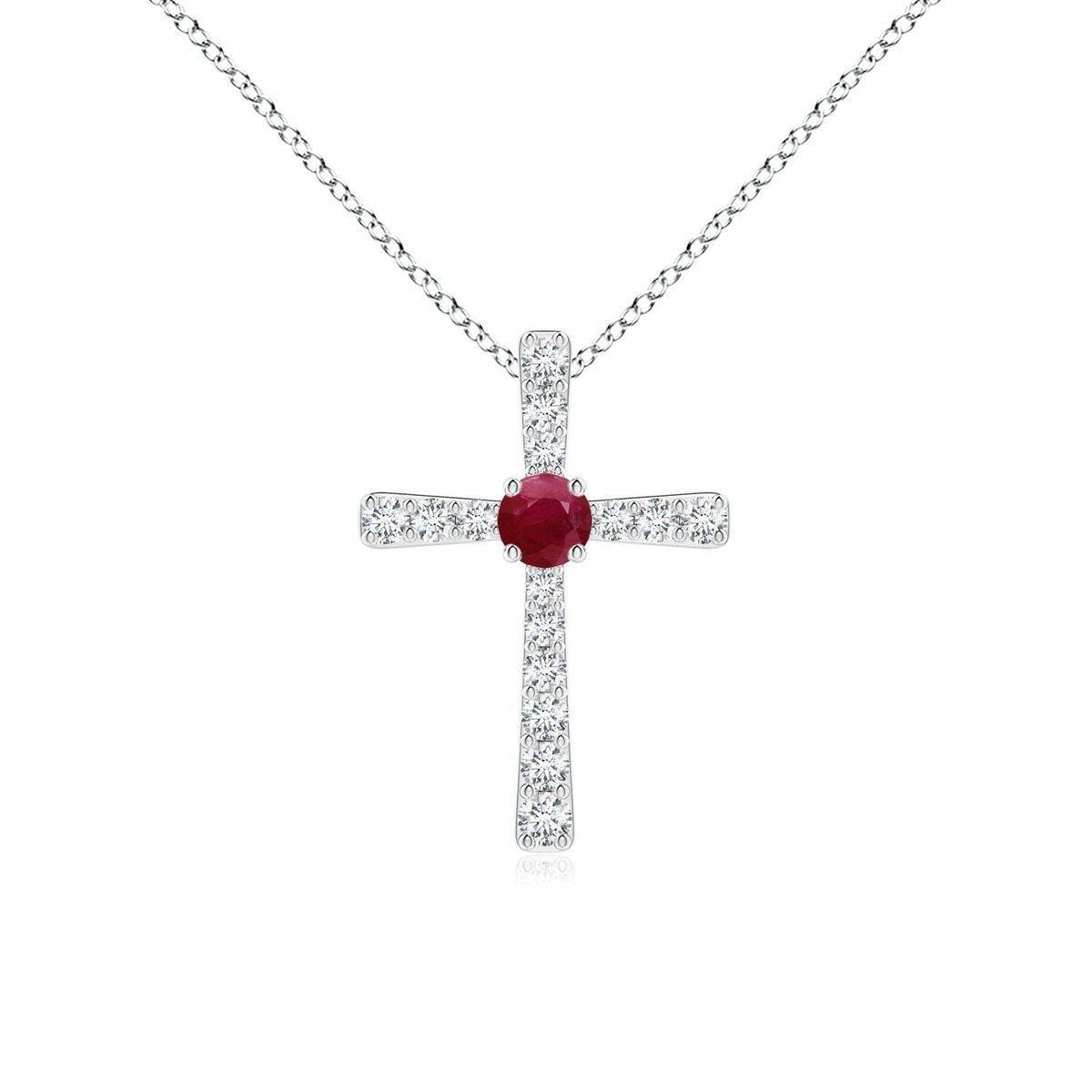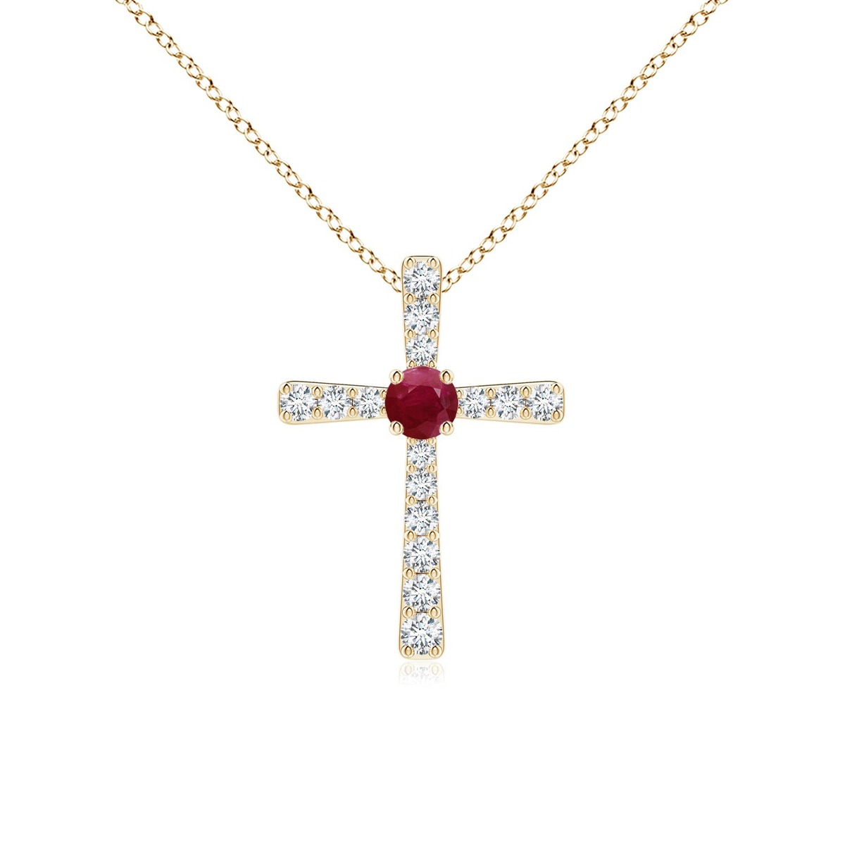 This cross pendant designed in 14k solid gold is a classic expression of your faith. It is studded with prong-set round diamonds and a radiant ruby in the centre, exuding a beautiful contrast.This Ruby necklace is crafted in Solid Gold ? a stunning choice for lovers of fine Ruby jewelry. Every item comes with an Angara Certificate of Authenticity, which will be sent to you via messages or with the package.