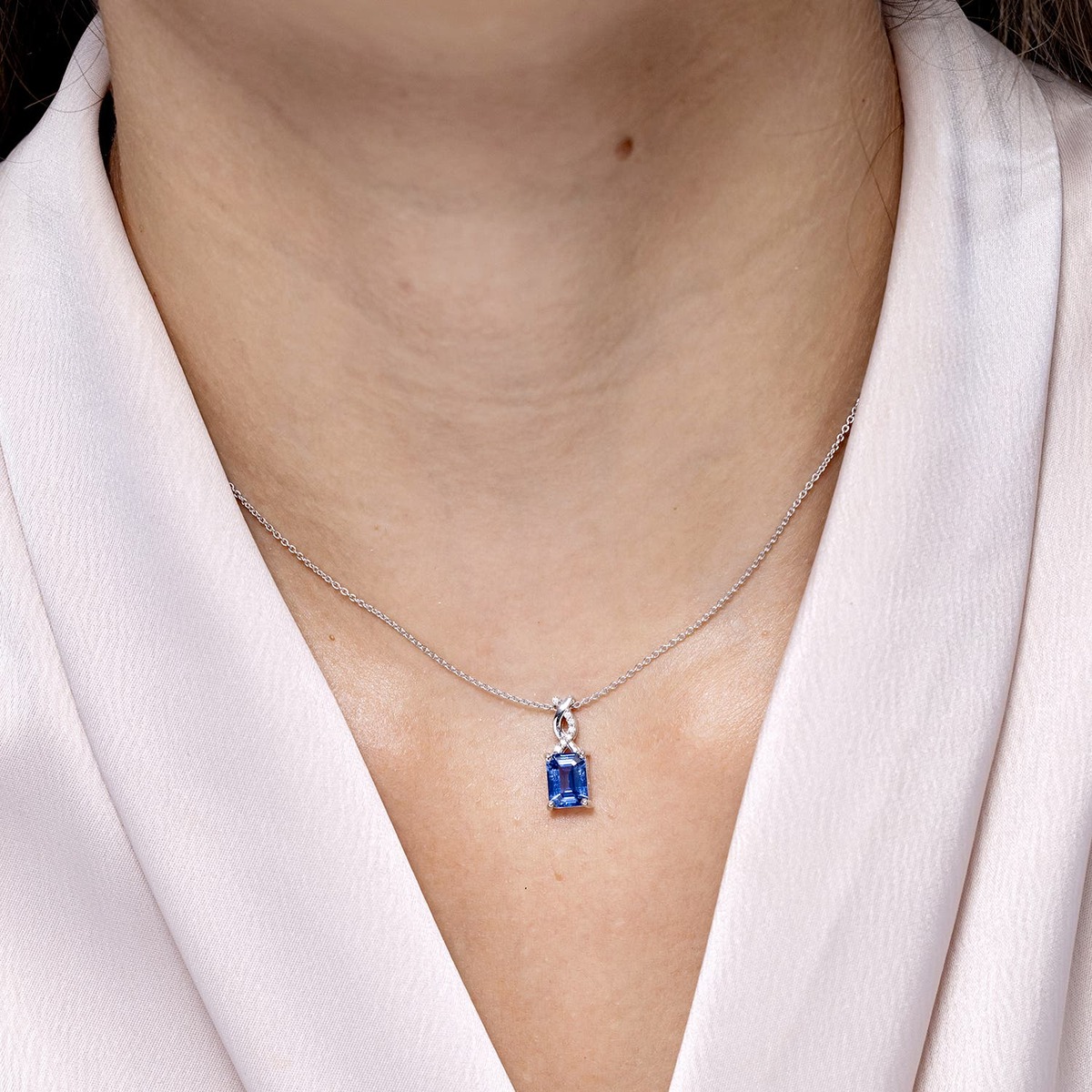 The emerald-cut tanzanite in prong setting captivates the senses with its bluish-violet brilliance. It is enhanced by the sparkling diamond accents partially embellished on the entwined metal bale. This stunning tanzanite infinity pendant is crafted in 14k solid gold.