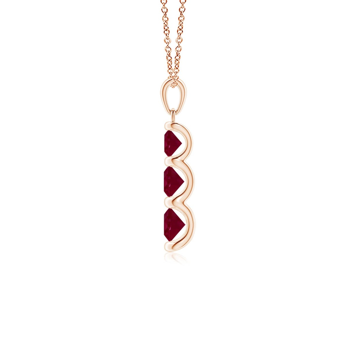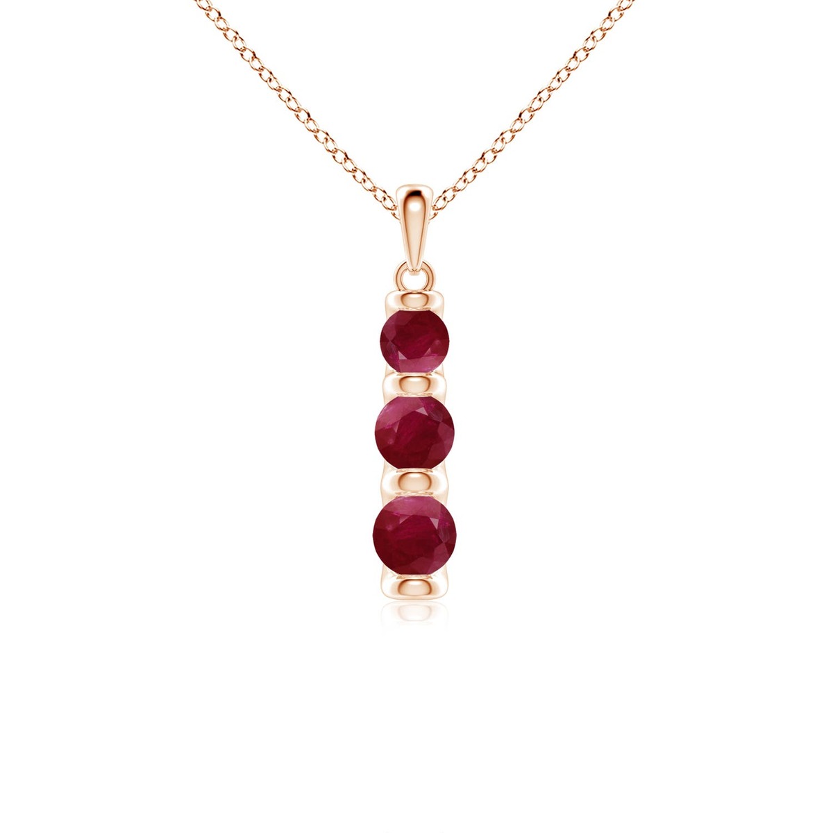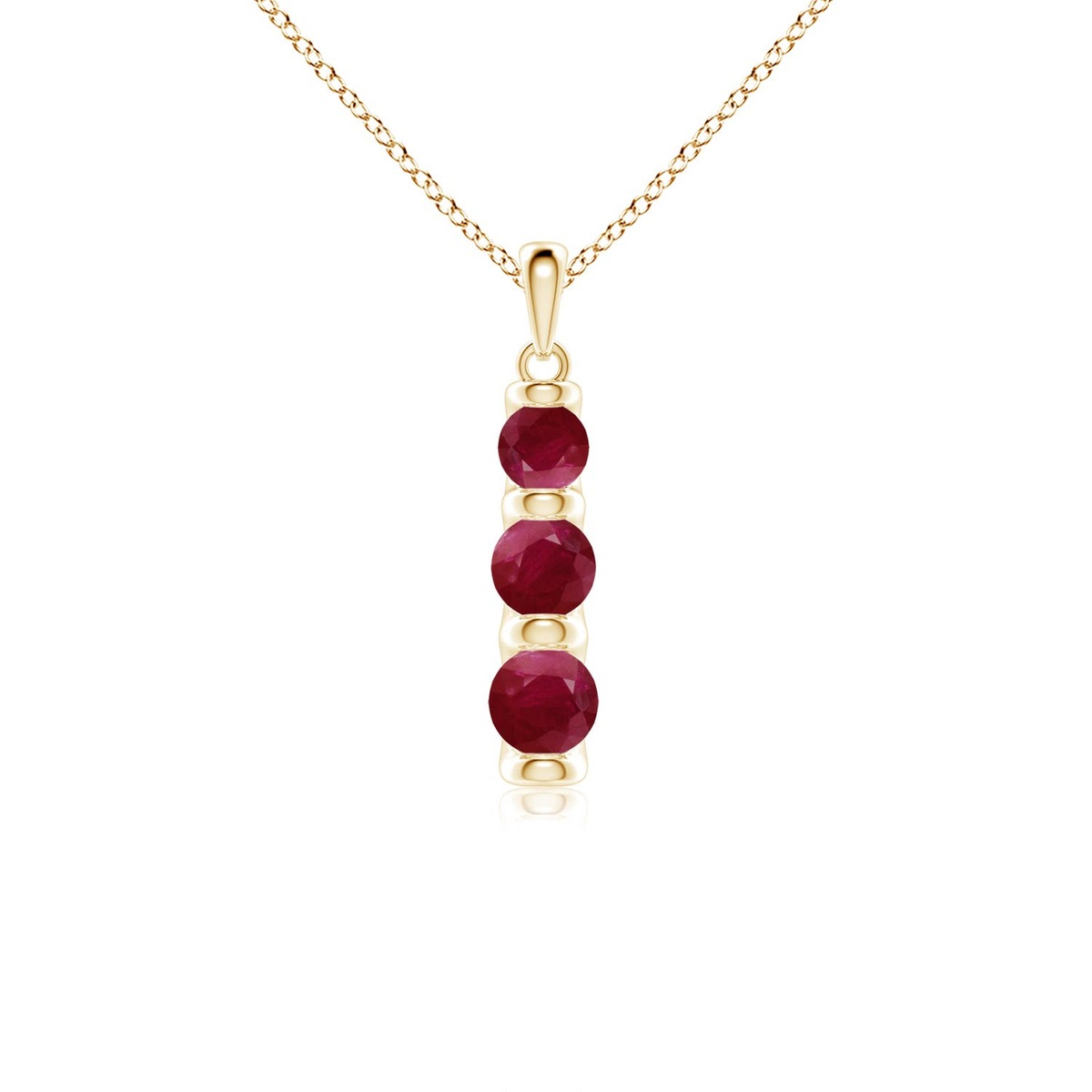 Three Stone Round Ruby Journey PendantThis Ruby necklace is crafted in Solid Gold ? a stunning choice for lovers of fine Ruby jewelry. Every item comes with an Angara Certificate of Authenticity, which will be sent to you via messages or with the package.