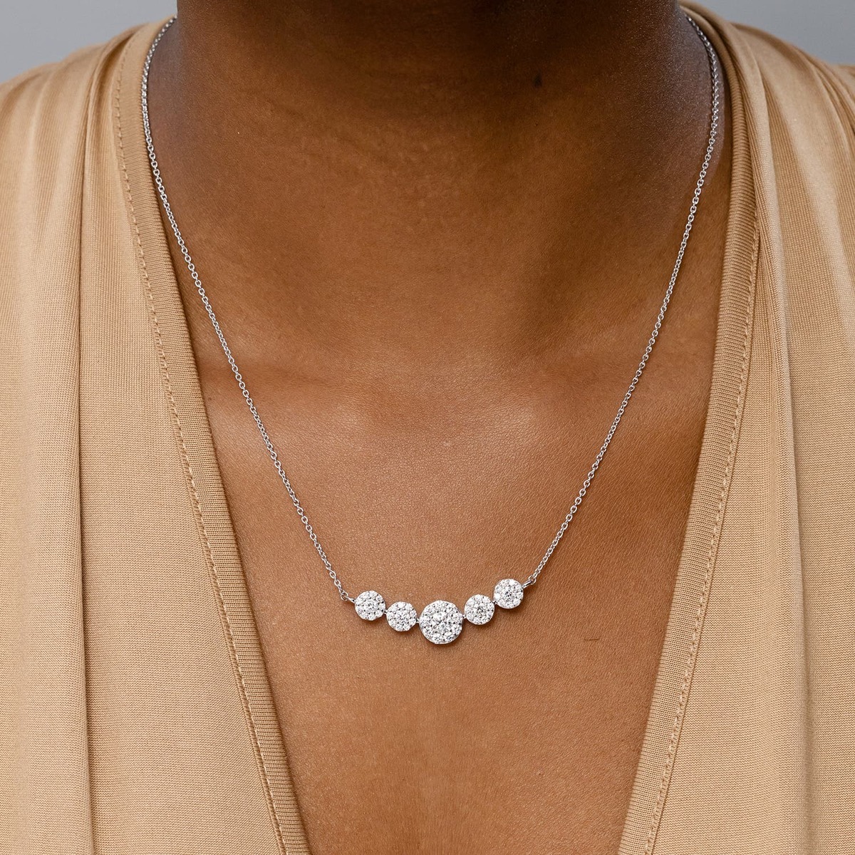 Exuding a dose of extravagance with celestial brilliance, this diamond five stone necklace is designed in 14k solid gold. Five round diamonds are horizontally connected in a graduating pattern and surrounded by halos of glimmering accent diamonds. They are secured in a fine prong setting.