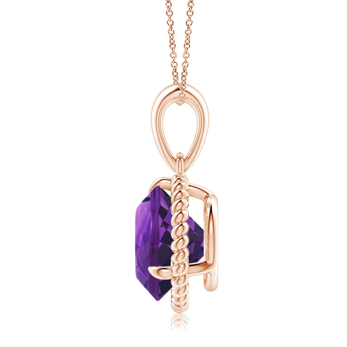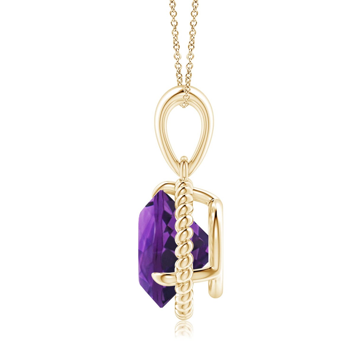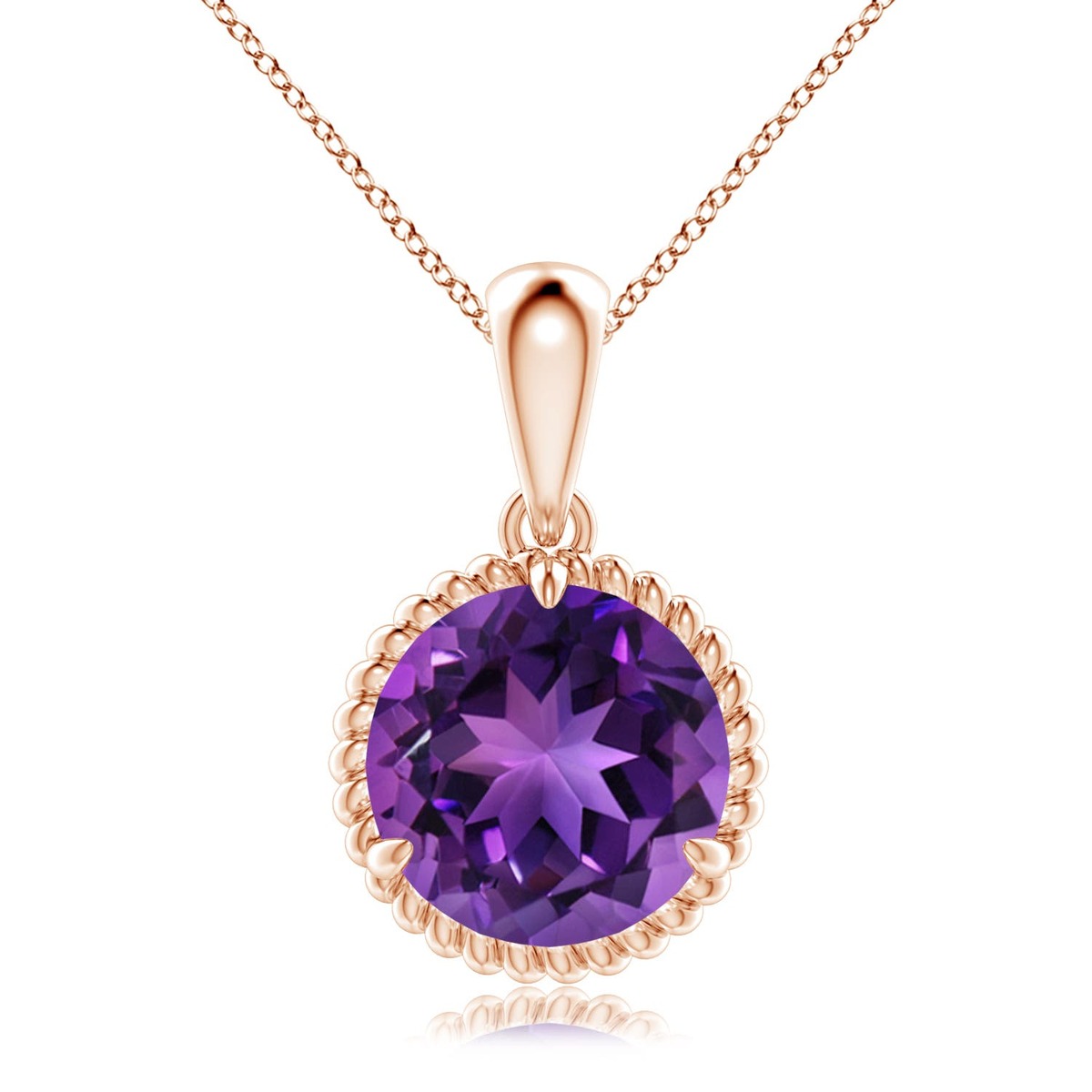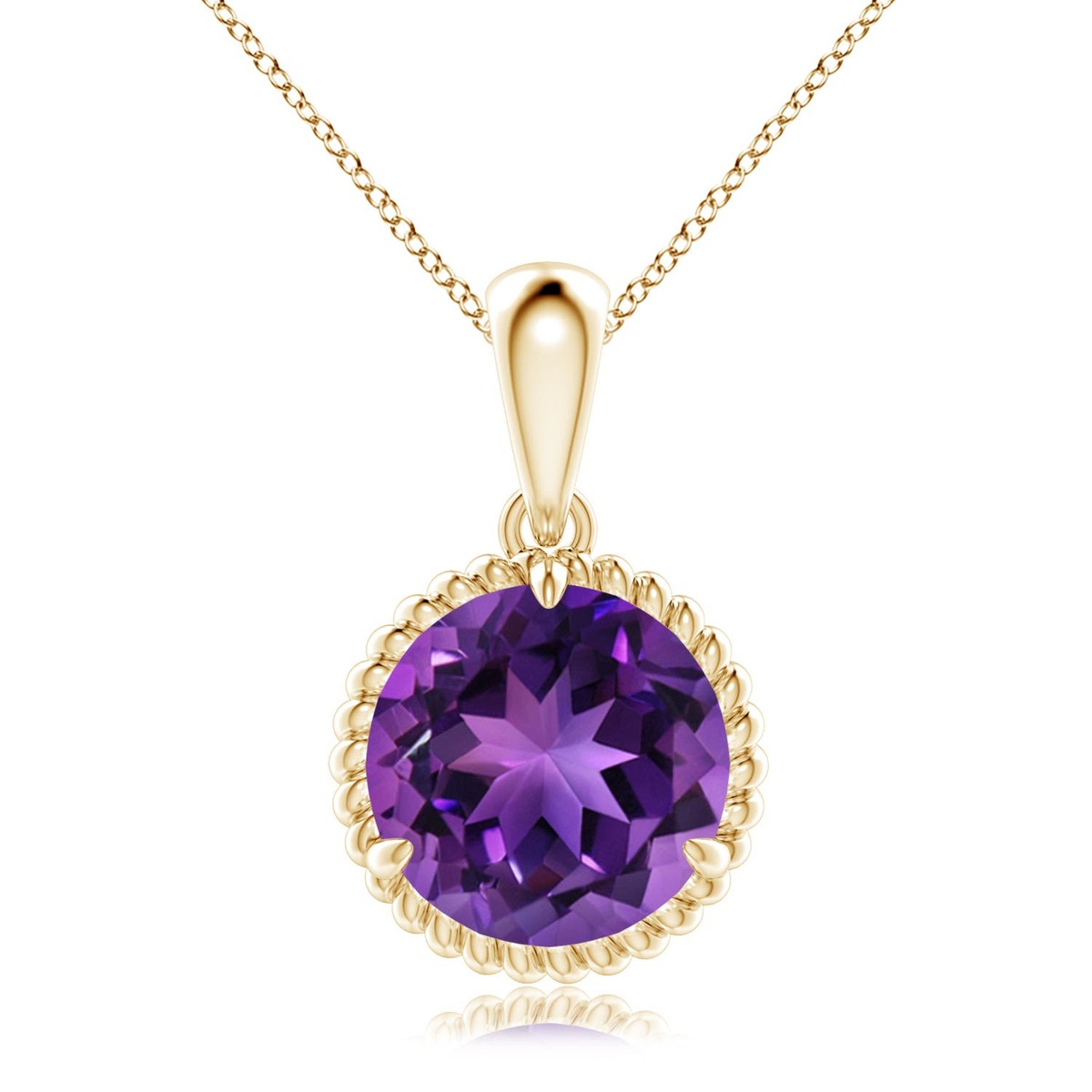 Exuding pure elegance, this amethyst solitaire dangle pendant is designed in 14k solid gold. The round claw prong set amethyst is surrounded by a twisted rope frame that lends a touch of uniqueness to the design.