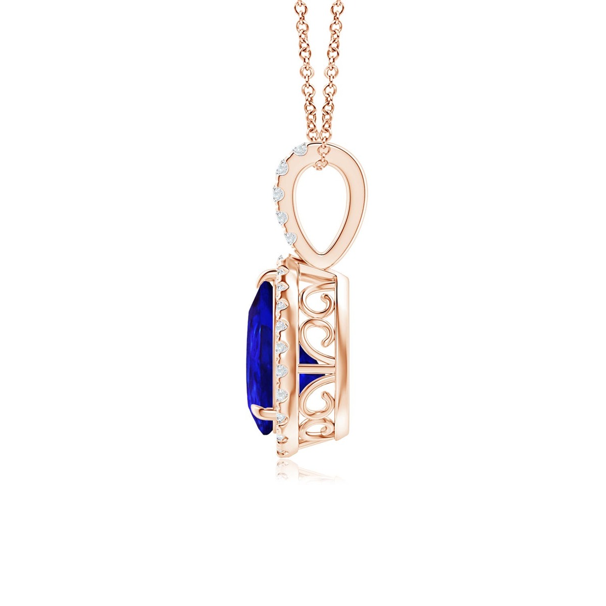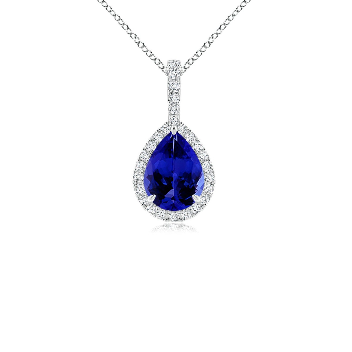 Exuding a charming blue and purple hue, this 14k solid gold teardrop tanzanite diamond pendant looks elegant. A halo of glistening diamonds surrounds the claw prong set gem. The diamond-studded single bale and the scrollwork detailing on the sides add to the overall beauty of this tanzanite halo pendant.
