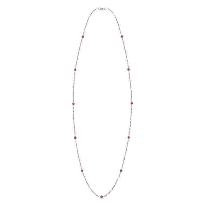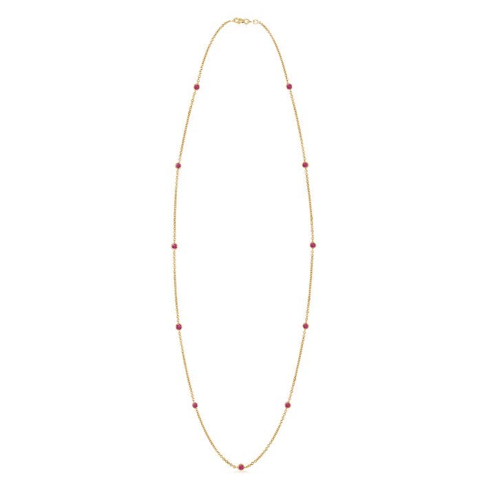 Exuding a sophisticated aura, this pink sapphire necklace is fashioned in 14k solid gold. A series of pink sapphires are bezel set at equal intervals on a fine-quality chain. The delightful pink gemstones glow luxuriously on this sapphire station necklace.