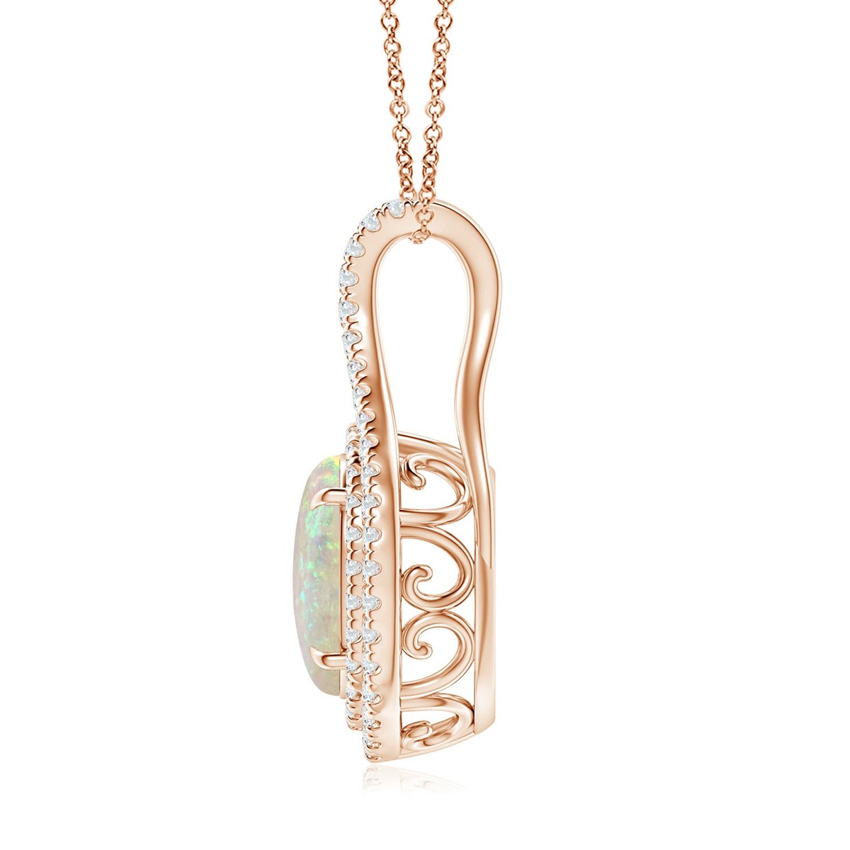 Adorned with a mesmerizing opal and precious diamonds, this gorgeous double halo pendant is a beauty in lustrous 14k solid gold. The outer halo forms into an elegant bale while the intricate scrollwork on the metal elevates the beauty of this oval opal and diamond pendant.