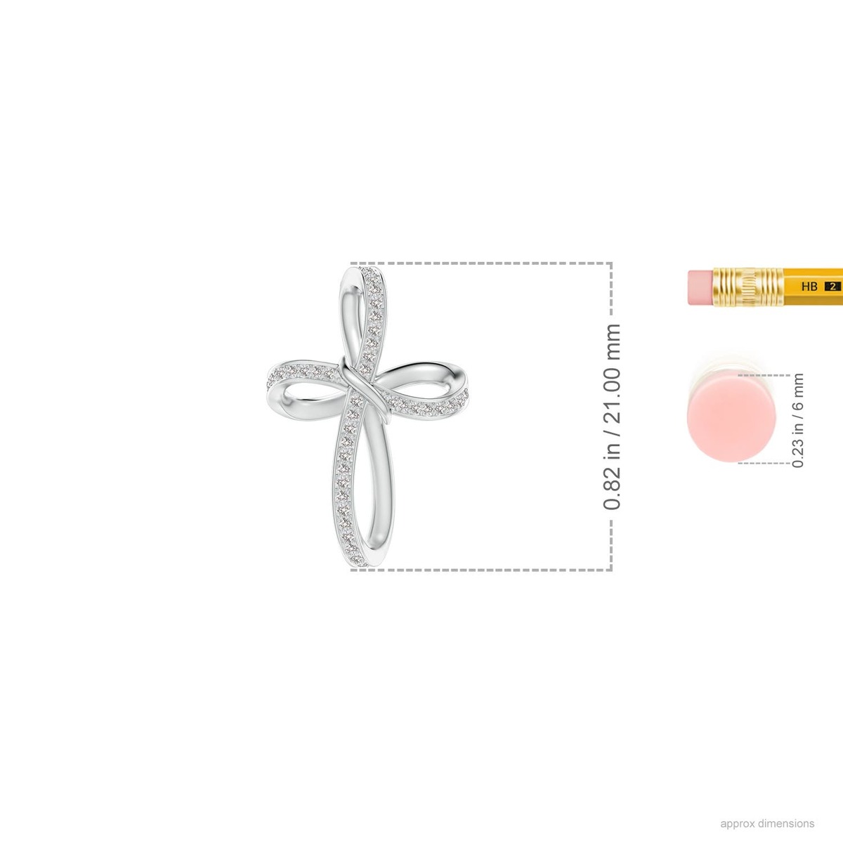 The 14k solid gold metal is twisted into an exquisite diamond infinity cross pendant. Glimmering white diamonds secured in a pave setting embellish the curves for a dazzling effect. This ribbon diamond pendant is complete with a fascinating metal swirl at the center.