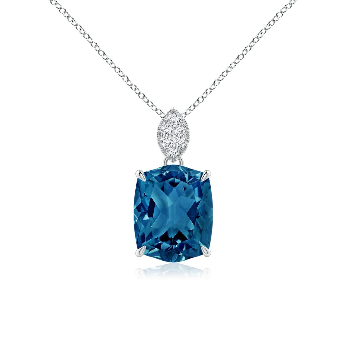 Topped with a leaf bale is the fancy-cut rectangular cushion London blue topaz in claw setting. The pave-set diamonds accentuate the mesmerizing greenish blue gem. This beautiful pendant in 14k solid gold is finished with milgrain edges around the bale.