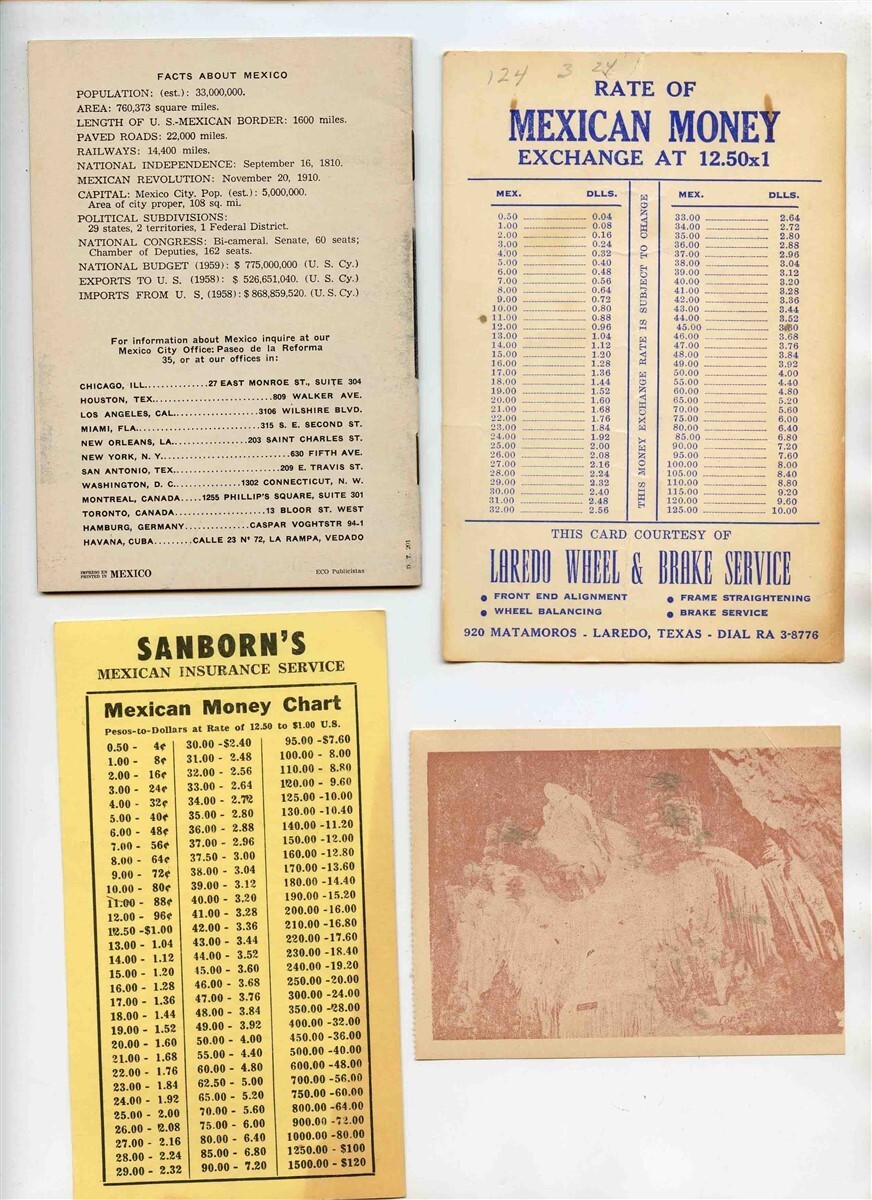 Ther are 8 items in this lot from Mexico. A 32 page booklet filled with black and white photos, Mexico Host to the World Booklet . Plus 6 differnt Travel Items including advertising cards with rate of Mexican Money Exchange rates on the back, museum admission ticket, Lions Club La Fuente Frozen Fountain Cards and a mailed Postcard of the Columna de la Independencia in Mexico City. Circa 1960's