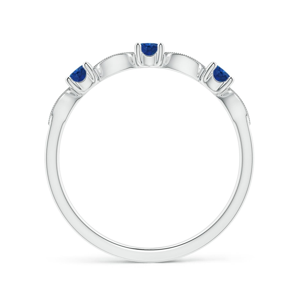 Unique in appearance, this marquise and dot band features three round blue sapphires linked by diamond studded marquise motifs. Intricate milgrain detailing adorns the elegant motifs infusing a touch of vintage charm to the design. This sapphire and diamond half eternity band is a beauty in 14k Gold.