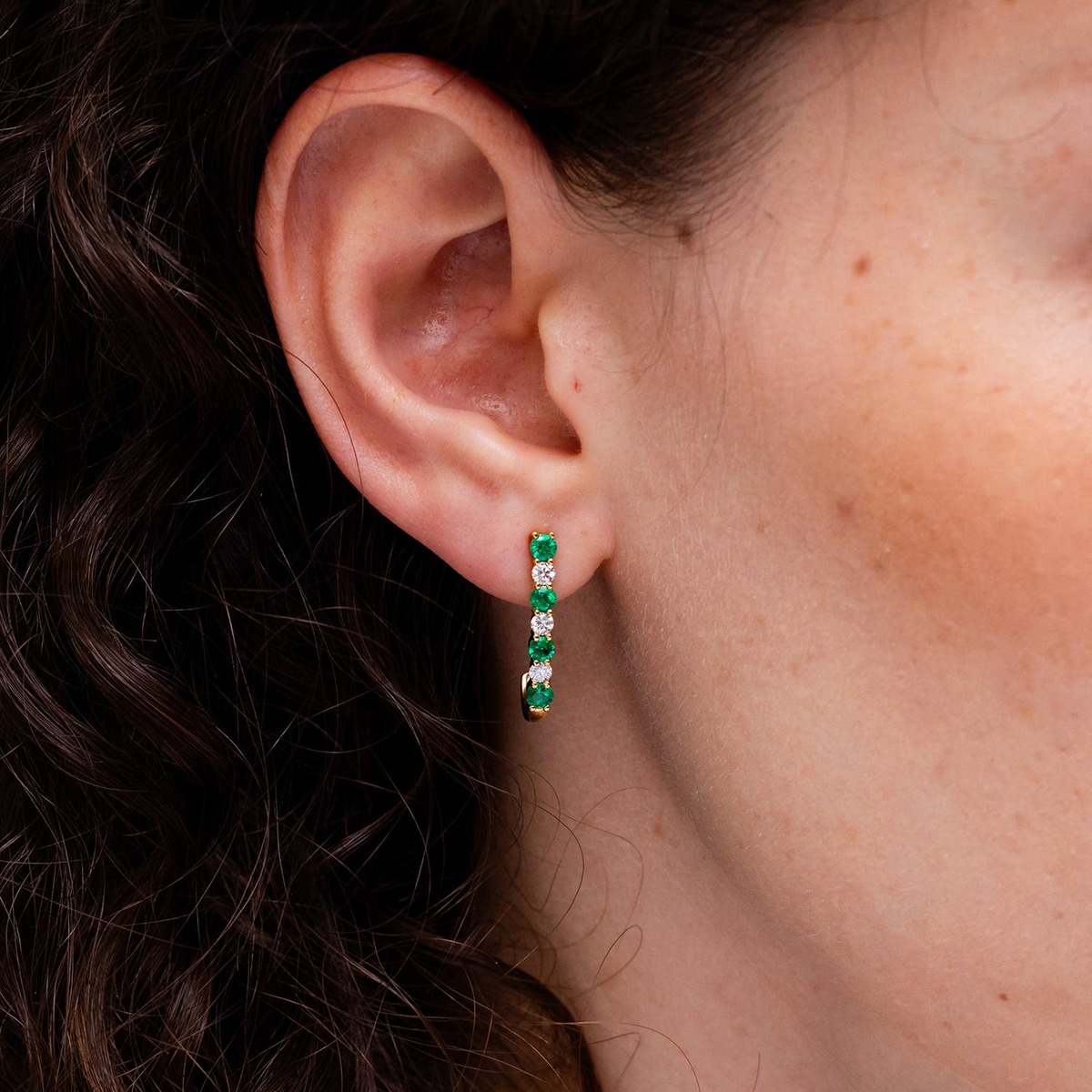 These stunning emerald and diamond hoop earrings are exquisitely crafted in 14k solid gold. The J hoops are alternately studded with lush green emeralds and sparkling diamonds for a surreal effect.