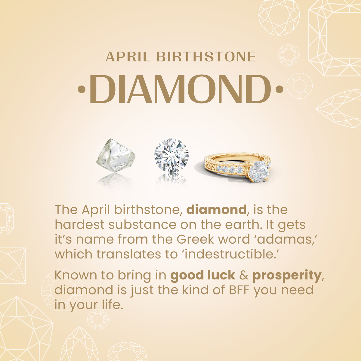 Renowned for their breathtaking sparkle and timeless elegance, white diamonds are the epitome of refined beauty. Symbolizing love, strength, purity and eternity, they?re a popular choice for celebrating life's most cherished moments with. Moreover, they're also the birthstone for April and the traditional gemstone for the 10th and 60th wedding anniversaries.
