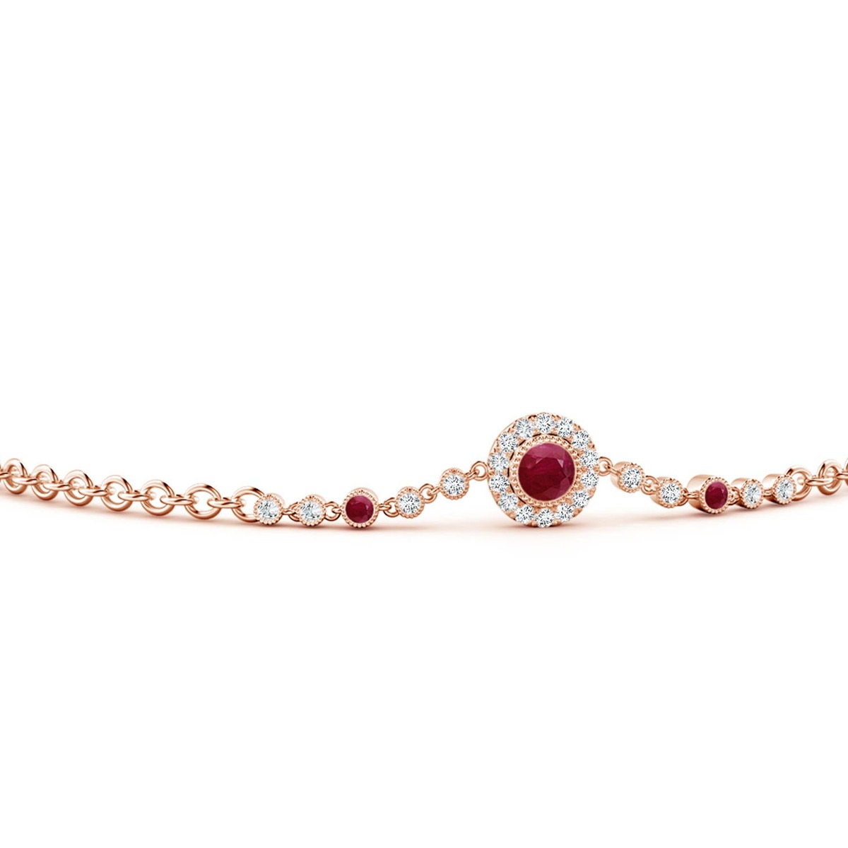A round ruby is surrounded by a halo of diamonds and connected to bezel-set ruby and diamond accents on this vintage style bracelet. The milgrain detailing completes the old world allure of this elegant 14k solid gold bracelet.