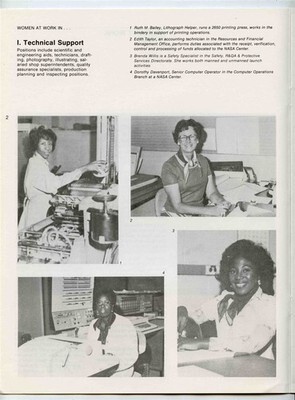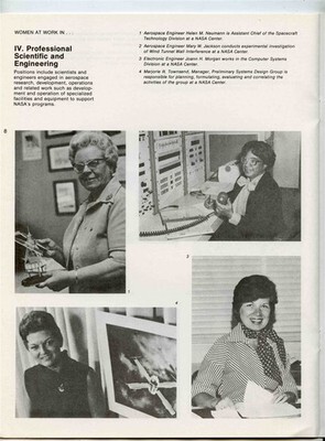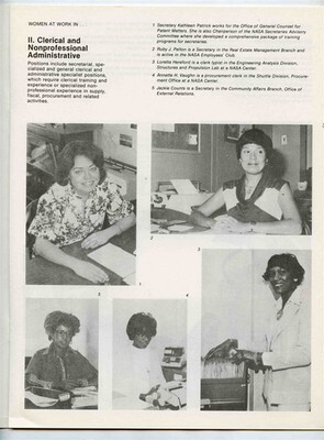 A 16 page booklet filled with photos and information on the Women of NASA. Includes women in Technical Support Positions, Clerical and Management Administrative, Professional Administrative and Professional Scientific and Engineering. Circa 1960's.